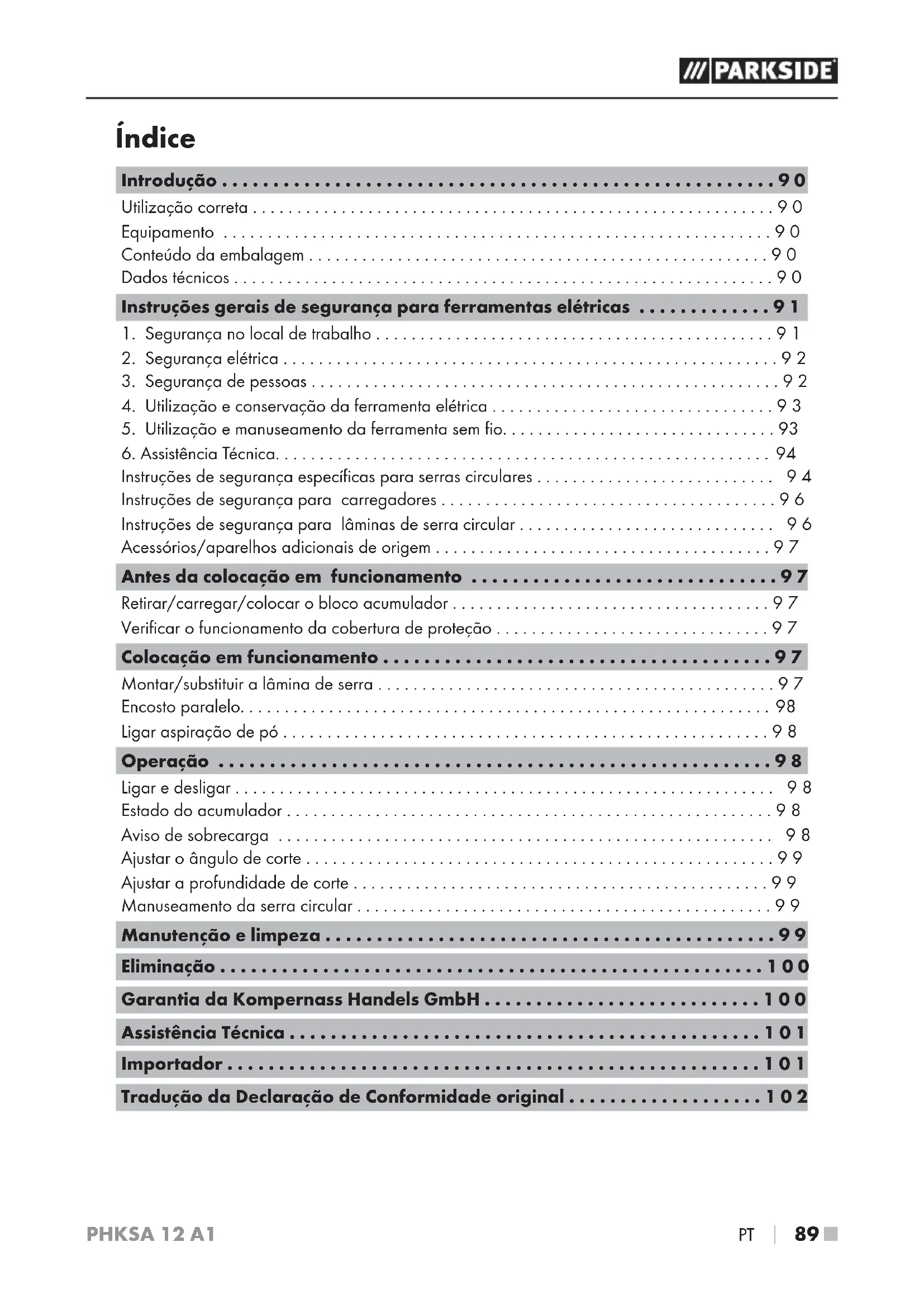 ou uma linha desenhada. Manutenção e limpeza AVISO! PERIGO DE FERIMENTOS! Antes de realizar quaisquer traba- lhos no aparelho, desligue-o e retire o acumulador. A serra circular de acumuladores não necessita de manutenção. ■ O aparelho deve estar sempre limpo, seco e livre de óleos ou lubrificantes. ■ Não podem entrar quaisquer líquidos no inte- rior dos aparelhos. ■ Utilize um pano seco para limpar o corpo do aparelho. Nunca utilize benzina, solventes ou detergentes agressivos para o plástico. ■ A cobertura de proteção deve poder mover-se sempre livremente e fechar de forma autónoma. Por isso, mantenha a zona em torno da cober- tura de proteção sempre limpa. Retire o pó e as aparas soprando com ar comprimido ou limpando com um pincel. ■ Se for necessário guardar um acumulador de iões de lítio durante um longo período de tem- po, o estado de carga tem de ser controlado regularmente. O estado de carga ideal situa-se entre 50 % e 80 %. O ambiente de armazena- mento ideal é fresco e seco. NOTA ► Peças sobresselentes não especificadas (como p. ex. acumulador, carregador) podem ser encomendadas através da nossa linha direta de Assistência Técnica.PHKSA 12 A1 ■ 100