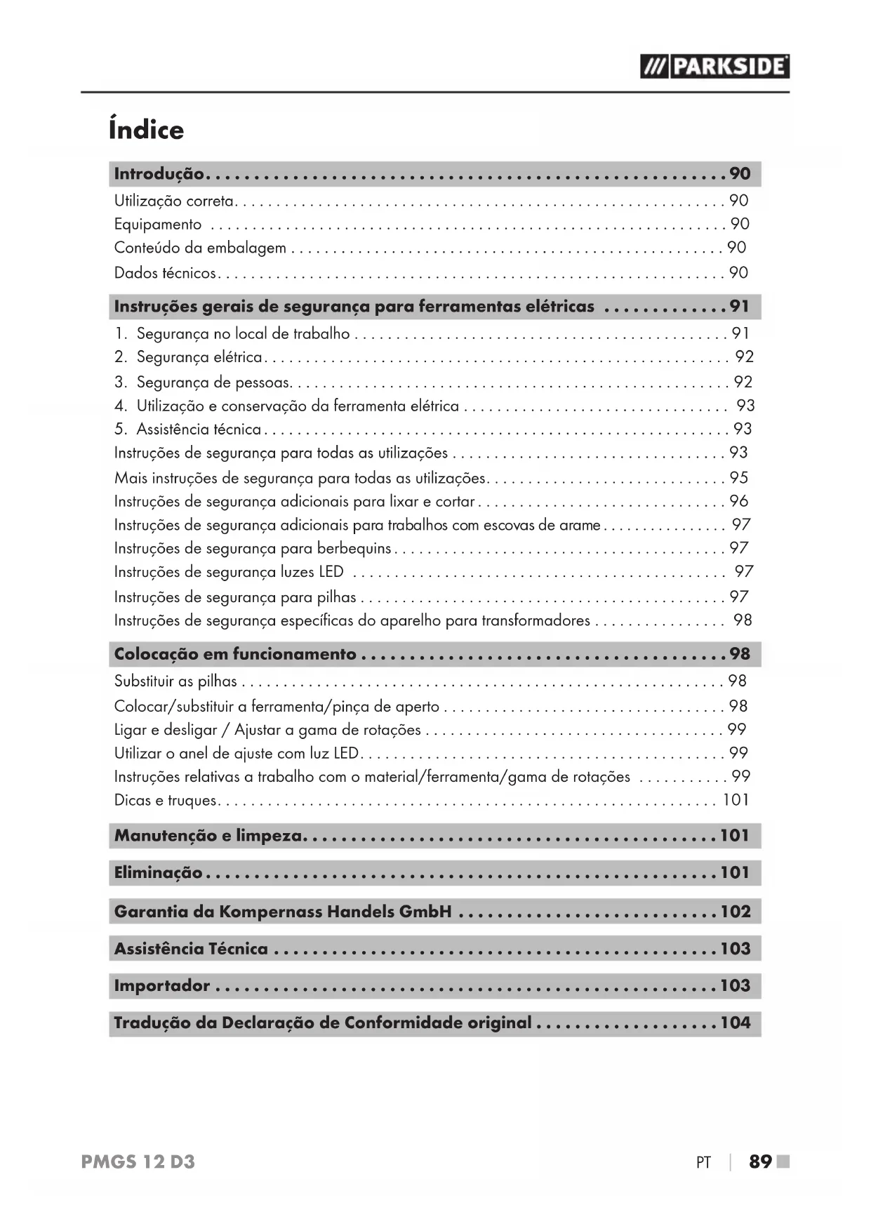 - Tradução da Declaração de Conformidade original IB_283031_PMGS12D3_LB8.indb 89 28.06.17 11:55PMGS 12 D3 ■ 90 p. 104