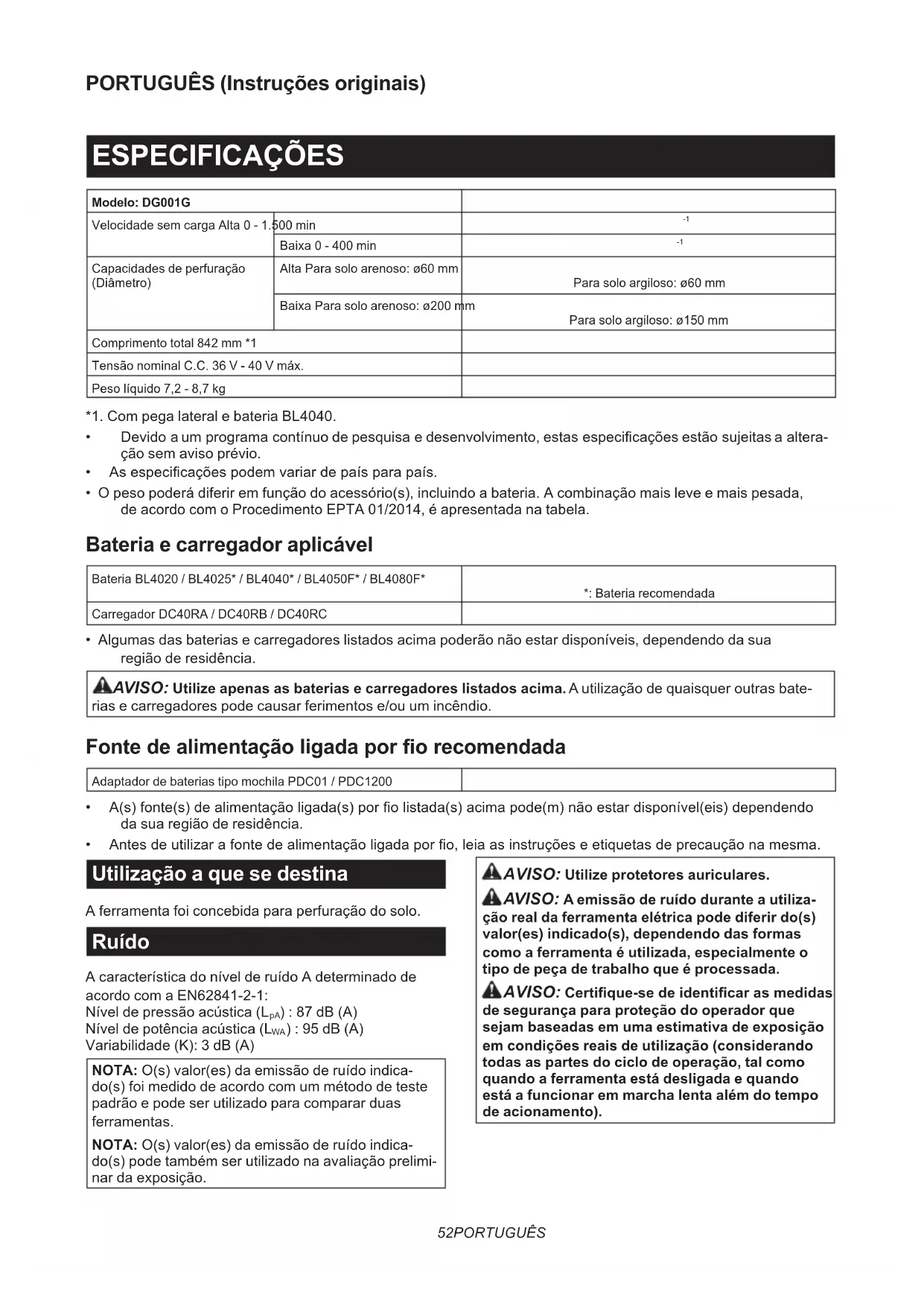 - O peso poderá diferir em função do acessório(s), incluindo a bateria. A combinação mais leve e mais pesada, de acordo com o Procedimento EPTA 01/2014, é apresentada na tabela. Bateria e carregador aplicável Bateria BL4020 / BL4025* / BL4040* / BL4050F* / BL4080F* *: Bateria recomendada Carregador DC40RA / DC40RB / DC40RC