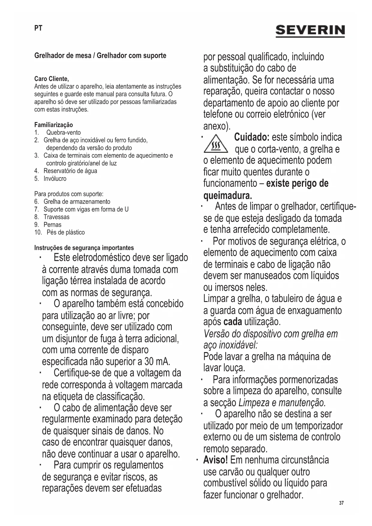 Cuidado: este símbolo indica que o corta-vento, a grelha e o elemento de aquecimento podem car muito quentes durante o funcionamento – existe perigo de queimadura. ∙ Antes de limpar o grelhador, certique- se de que esteja desligado da tomada e tenha arrefecido completamente. ∙ Por motivos de segurança elétrica, o elemento de aquecimento com caixa de terminais e cabo de ligação não devem ser manuseados com líquidos ou imersos neles. Limpar a grelha, o tabuleiro de água e a guarda com água de enxaguamento após cada utilização. Versão do dispositivo com grelha em aço inoxidável: Pode lavar a grelha na máquina de lavar louça. ∙ Para informações pormenorizadas sobre a limpeza do aparelho, consulte a secção Limpeza e manutenção. ∙ O aparelho não se destina a ser utilizado por meio de um temporizador externo ou de um sistema de controlo remoto separado. ∙ Aviso! Em nenhuma circunstância use carvão ou qualquer outro combustível sólido ou líquido para fazer funcionar o grelhador. PT38 142 x 208 mm ∙ Cuidado: Não cubra a grelha com folha de alumínio, pratos de churrasco ou outros objetos, já que a acumulação de calor resultante poderia causar danos graves na grelha. ∙ Pode colocar no máximo 1,1 litros de água no reservatório de água. ∙ Este aparelho destina-se a aplicações domésticas ou semelhantes, como em: - cozinhas para funcionários em lojas, escritórios e ambientes de trabalho semelhantes; - ambientes de trabalho agrícola; - utilização por clientes em hotéis, motéis e alojamentos similares; - ambientes do tipo “alojamento e pequeno-almoço”. ∙ Este aparelho pode ser utilizado por crianças (com pelo menos 8 anos de idade) e por pessoas com capacidades físicas, sensoriais ou mentais reduzidas ou que careçam de experiência e conhecimento, desde que sejam supervisionadas ou recebam instruções sobre a utilização do aparelho e compreendam plenamente todos os perigos e precauções de segurança envolvidos. ∙ As crianças devem ser vigiadas para assegurar que não brinquem com o aparelho. ∙ Não deve permitir que as tarefas de limpeza e manutenção sejam efetuadas por crianças, a menos que estas sejam supervisionadas e tenham pelo menos 8 anos de idade. ∙ O aparelho e o seu cabo de alimentação elétrica devem estar sempre fora do alcance das crianças com menos de 8 anos de idade. ∙ Cuidado: mantenha quaisquer materiais de embalagem bem afastados das crianças; existe risco de asxia. ∙ Sempre que utilizar o aparelho, examine meticulosamente o corpo principal, incluindo o cabo de alimentação elétrica e qualquer acessório aplicado, em busca de possíveis falhas. Se, por exemplo, o aparelho tiver caído sobre uma superfície dura ou o seu cabo de alimentação elétrica tiver sido puxado com força excessiva, não deve continuar a utilizá-lo: até mesmo os danos invisíveis podem ter efeitos adversos sobre a segurança de funcionamento do aparelho. ∙ Durante a utilização, o grelhador de churrasco deve ser colocado numa superfície nivelada, resistente ao calor e impermeável a salpicos e manchas. Ao grelhar alimentos com elevado teor de gordura ou humidade, os salpicos nem sempre são evitáveis. ∙ Não posicione o grelhador junto a uma parede ou um canto e certique-se de que não são guardados materiais inamáveis junto a ele. ∙ Não deve instalar o quebra-vento quando usar o produto em ambientes de interior. ∙ Os alimentos grelhados com gordura podem incendiar, por isso deve colocar água no compartimento de água sempre que usar o produto! Só depois é que deve ligar a cha de alimentação. Desta forma arrefece-se o reservatório de água, reduz-se o fumo e facilita-se a limpeza. ∙ Mantenha atenção ao nível da água. Deve ser acrescentada água conforme a necessidade, assegurando sempre que não entre em contacto com o elemento de aquecimento. Cuidado: desligue o grelhador da tomada antes de acrescentar água. ∙ Antes de ligar e utilizar, verique se o elemento de aquecimento está introduzido corretamente na caixa e no reservatório de água. ∙ Durante a utilização, o grelhador de churrasco deve estar permanentemente sob vigilância. ∙ A resistência e a grelha do grelhador cam muito quentes durante o funcionamento. Mesmo depois de desligar, não toque no elemento de aquecimento enquanto ainda estiver quente. Existe perigo de queimaduras! ∙ Mantenha o cabo elétrico longe de qualquer parte aquecida do aparelho. ∙ Encaminhe o cabo elétrico por forma a que ninguém possa tropeçar nele. ∙ Retire sempre a cha da tomada - antes de encher com água; - no nal de cada utilização; - no caso de mau funcionamento; - antes de limpar o aparelho.39 142 x 208 mm ∙ A utilização de uma extensão elétrica ou de um enrolador causa uma perda de potência, possivelmente combinada com uma subsequente acumulação de calor no cabo. Por conseguinte, é necessário desenrolar completamente o cabo antes da utilização. Certique-se de que o cabo esteja aprovado para utilização ao ar livre e para a potência especicada (ver a etiqueta de classicação). ∙ Para produtos com suporte: Pode colocar no máximo 4 kg sobre a grelha. ∙ Nunca mover o grelhador enquanto este estiver em funcionamento. ∙ Cuidado! Permitir sempre que o grelhador arrefeça completamente antes de o mover, limpar, cobrir ou armazenar. ∙ Cuidado! Quando o grelhador não estiver a ser utilizado, o elemento de aquecimento com caixa terminal deve ser removido do grelhador e armazenado em divisão interior seca. ∙ As restantes peças do grelhador não devem ser mantidas ao ar livre ou em locais abertos onde possam ser afetadas pelas condições meteorológicas. ∙ Declinamos qualquer responsabilidade se a avaria resultar de uso indevido, ou se não forem respeitadas as instruções. ∙ Este produto encontra-se em conformidade com todas as diretivas comunitárias referentes a rotulagem. Antes da primeira utilizaç