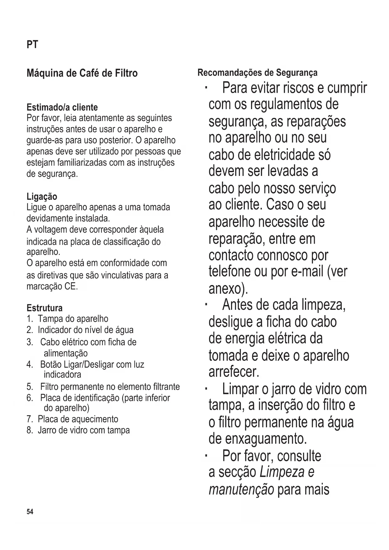 Recomandações de Segurança ∙ Para evitar riscos e cumprir com os regulamentos de segurança, as reparações no aparelho ou no seu cabo de eletricidade só devem ser levadas a cabo pelo nosso serviço ao cliente. Caso o seu aparelho necessite de reparação,entreem contacto connosco por telefone ou por e-mail (ver anexo). ∙ Antes de cada limpeza, desligueachadocabo de energia elétrica da tomada e deixe o aparelho arrefecer. ∙ Limpar o jarro de vidro com tampa,ainserçãodoltroe oltropermanentenaágua de enxaguamento. ∙ Por favor, consulte asecçãoLimpeza e manutenção para mais PT104 x 142 mm