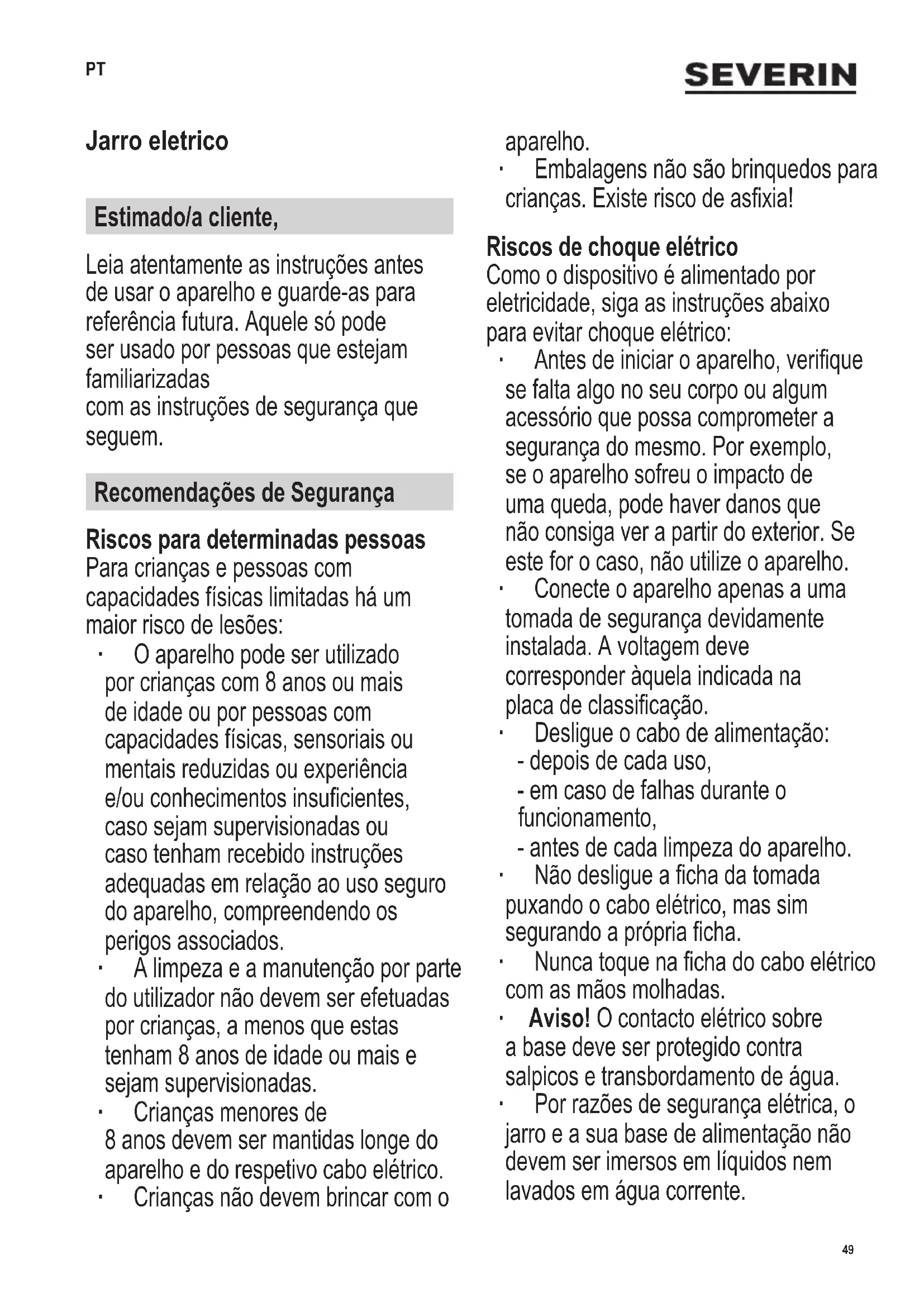 Proteção contra sobreaquecimento O controlo de temperatura instalado protege a resistência de sobreaquecimento no caso de o aparelho ser inadvertidamente ligado sem água ou a placa de aquecimento ter sido calcicada. Neste caso, não será possível ligar o aparelho. Deixe primeiro o jarro elétrico arrefecer e, se necessário, descalcique-o antes de voltar a usá-lo. Antes de utilizar pela primeira vez ∙ Desembale o aparelho e remova todo o conteúdo da embalagem. ∙ Por motivos de higiene, despejar o primeiro enchimento a ferver da chaleira nova. Modo de ferver água ∙ Retirar o recipiente de água da base e retirar a tampa. ∙ Encher o recipiente de água com a quantidade de água pretendida. É essencial respeitar as marcações Min (0,5 l) e Max (1,7 l) para a quantidade de enchimento. ∙ Colocar a tampa. ∙ Coloque o jarro outra vez na base de alimentação. ∙ Ligar a cha de tomada e ligar a chaleira com o interruptor de ligar/desligar. Art.º N.º 3454: A luz indicadora acende, desde que o aparelho esteja ligado. Art.º N.º 3459: O anel iluminado acende, desde que o aparelho esteja ligado. ∙ O jarro entra em funcionamento e começa a aquecer a água até alcançar o ponto de ebulição. ∙ O processo pode ser cancelado em qualquer altura, premindo o interruptor de ligar/desligar. ∙ Retire o jarro da base de alimentação para servir água. ∙ A tampa deve permanecer fechada quando esvaziar a água, de modo que não escape vapor. Cuidado! O vapor quente pode subir ao derramar! ∙ Após o uso, desligue o aparelho da fonte de alimentação. ∙ Não deixe água no jarro.52 142 x 208 mm Compartimento para o cabo elétrico Na parte inferior da base de alimentação do aparelho há um enrolador para o cabo. Este serve para armazenar o cabo ou encurtar o seu comprimento. Descalcicação ∙ Dependendo do teor de calcário na água, este pode acumular-se na resistência. Por isso, descalcique regularmente o jarro elétrico. ∙ A garantia não se aplica a aparelhos que não funcionem corretamente devido à falta de descalcicação. ∙ Uma mistura de 500 ml de água e 40 ml de essência de vinagre é adequada para a descalcicação: - Preencha a solução de descalcicação; - aqueça como de costume; - deixe agir por um curto período de tempo; - Em seguida, enxague o jarro com água. ∙ Certique-se de que há ventilação suciente e não inale o vapor de vinagre. ∙ Não deite produtos de descalcicação em pias esmaltadas. Limpeza e manutenção ∙ Antes de cada limpeza, desligue a cha do cabo de energia elétrica da tomada e deixe o jarro arrefecer. ∙ Por razões de segurança elétrica, o jarro e a sua base de alimentação não devem ser imersos em líquidos nem ser lavados em água corrente. ∙ Para a sua limpeza basta um pano humedecido. ∙ Não utilize produtos de limpeza fortes ou abrasivos nem escovas duras. Filtro de calcário ∙ Em caso de sujidade intensa, o ltro de calcário no bico pode ser removido e limpo com uma escova macia. ∙ Após a limpeza, substituir o ltro de calcário. Para o fazer, premir o ltro de calcário para o bico a partir do interior. Eliminação Os aparelhos marcados com este símbolo devem ser eliminados separadamente dos resíduos domésticos, já que contêm materiais valiosos que podem ser reciclados. A eliminação adequada protege o ambiente e a saúde humana. As suas autoridades locais ou o revendedor podem facultar-lhe informações sobre o assunto. Garantia Nas seguintes condições, os direitos de garantia obrigatórios perante o vendedor e eventuais garantias permanecem intactos. Caso necessite de usufruir da sua garantia, contacte o comerciante diretamente. Além disso, a SEVERIN concede uma garantia de 2 anos com efeito a partir da data da compra do produto. Neste período, resolveremos qualquer defeito de fabrico ou de material que prejudique signicativamente o funcionamento do aparelho. Quaisquer outras reivindicações serão rejeitadas. Excluídos da garantia estão: Danos causados devido à não observância das instruções de uso, manuseio inadequado ou desgaste normal, bem como peças facilmente quebráveis, como, por exemplo, vidro, plástico ou lâmpadas. A garantia expira em caso de intervenção de agências não autorizadas pela SEVERIN. Se for necessária uma reparação, entre em contacto com o nosso atendimento ao cliente por telefone ou por e-mail. Os detalhes de contacto estão anexados a este manual.53 142 x 208 mm Resolução de problemas Problema Possível causa Ação O aparelho não funciona. O aparelho não está ligado à corrente elétrica.. Ligue a cha do cabo elétrico à tomada. A tomada tem defeito. Verique se a tomada funciona com outro aparelho. O aparelho não foi colocado corretamente sobre a base. Posicione o aparelho corretamente. A regulação da temperatura foi desligada. Deixe o aparelho arrefecer e, se necessário, descalcique-o. O processo de aquecimento demora mais do que o normal. O aparelho está calcicado. Descalcique o aparelho (veja Descalcicação). O aparelho emite ruídos ao aquecer. O aparelho está calcicado. Descalcique o aparelho (veja Descalcicação). Caso o problema não tenha podido ser resolvido com o auxílio da tabela, entre em contacto com o nosso serviço ao cliente. Os detalhes de contacto podem ser encontrados anexados a este manual. Especicações técnicas Modelo, N° Chaleira de vidro WK 3454 WK 3459 Alimenta ção 220-240 V~, 50-60 Hz Potência 2000 - 2400 Watts Medidas (L x A x P) 23,0 x 30,0 x 18,0 cm Peso 1,8 kg Classic ação Não despejar no lixo doméstico Este aparelho está em conformidade com as diretivas de marcação CE.54 142 x 208 mm Czajnik do gotowania wody i parzenia herbaty Szanowni Klienci! Przed użyciem urządzenia proszę dokładnie zapoznać się z poniższą instrukcją, którą należy zachować do późniejszego wglądu. Z urządzenia mogą korzystać wyłącznie osoby, które zapoznały się z poniższą instrukcją.