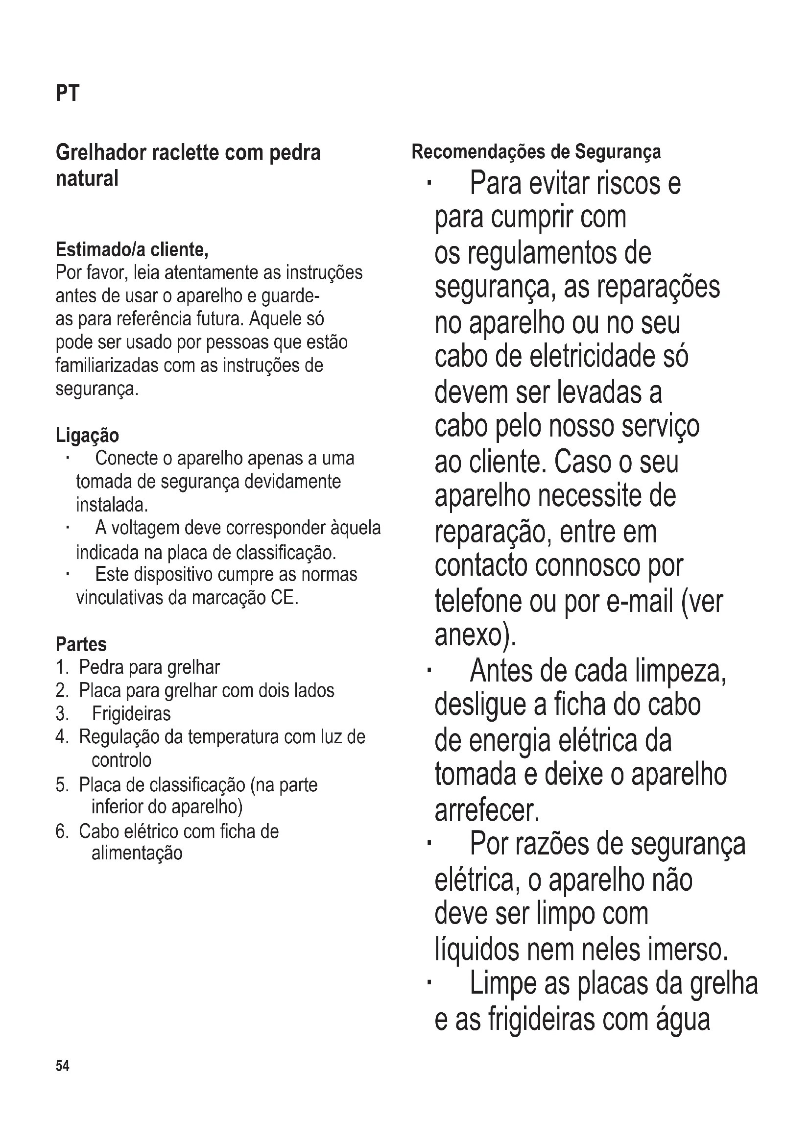 quente e detergente. Lave a pedra para grelhar apenas em água corrente. Por favor, consulte a secção “Limpeza e manutenção” para ver detalhes. ∙ O aparelho não se destina a ser operado com um temporizador externo ou um sistema de controlo remoto. ∙ O aparelho destina-se a ser utilizado em situações domésticas e semelhantes, por exemplo: - em cozinhas para funcionários em lojas, escritórios e ambientes de trabalho; - em empresas agrícolas; - por hóspedes em hotéis, motéis e outros ambientes residenciais; - em alojamentos B&B. ∙ O aparelho pode ser utilizado por crianças com mais de 8 anos de idade ou por pessoas com capacidades físicas, sensoriais ou mentais reduzidas ou experiência e/ou conhecimentos insucientes, caso sejam supervisionadas ou caso tenham recebido instruções adequadas em relação ao uso seguro do aparelho, compreendendo os perigos associados. ∙ As crianças não devem brincar com o aparelho. ∙ A limpeza e a manutenção por parte do utilizador não devem ser efetuadas por crianças, a menos que estas tenham 8 anos de idade ou mais e sejam supervisionadas. ∙ Crianças menores de 8 anos devem ser mantidas longe do aparelho e do56 104 x 142 mm respetivo cabo elétrico. ∙ Embalagens não são brinquedos para crianças. Existe risco de asxia! ∙ Antes de iniciar o aparelho, verique se falta algo no seu corpo ou algum acessório que possa comprometer a segurança do mesmo. Por exemplo, se o aparelho sofreu o impacto de uma queda, pode haver danos que não consiga ver a partir do exterior. Se este for o caso, não utilize o aparelho. ∙ O revestimento do aparelho, a placa para grelhar de dois lados e as frigideiras cam quentes durante o uso e permanecerão quentes por algum tempo. Risco de queimaduras! ∙ Nunca deixe o aparelho sem vigilância durante o uso. ∙ O cabo elétrico não deve tocar nas partes quentes do aparelho. ∙ O surgimento de respingos é inevitável no caso de alimentos gordurosos. Por isso, coloque o aparelho sobre uma superfície plana e estável, resistente ao calor e a respingos. ∙ Não coloque o aparelho diretamente ao lado de uma parede ou em um canto, além disso, afaste objetos facilmente inamáveis das proximidades. ∙ Não coloque o aparelho sobre superfícies quentes (por exemplo, fogões elétricos) nem nas proximidades de chamas de gás. ∙ Nunca use o aparelho no exterior. ∙ Antes de utilizar a placa para grelhar de dois lados ou a pedra para grelhar, coloque-as sobre a resistência. ∙ Desligue o cabo de alimentação: - depois de cada uso, - em caso de falhas durante o funcionamento, - antes de cada limpeza do aparelho. ∙ Não desligue a cha da tomada puxando o cabo elétrico, mas sim segurando a própria cha. ∙ Se o aparelho for operado incorretamente ou para um m que não o recomendado, nenhuma responsabilidade será assumida por qualquer dano que possa ocorrer. Possibilidades de uso O aparelho é um grelhador raclette elétrico adequado para grelhar carnes magras, peixe e legumes e para gratinar queijo. Qualquer outro uso não mencionado nas instruções é considerado impróprio e pode resultar em ferimentos graves ou danos ao aparelho. Antes de utilizar pela primeira vez ∙ Remova todo o conteúdo da embalagem. ∙ Antes de utilizar pela primeira vez a placa para grelhar de dois lados, a pedra para grelhar e as frigideiras, limpe-as com um pano húmido. ∙ Antes do uso, aqueça a placa/pedra para grelhar e as frigideiras sem alimentos por aproximadamente 10 minutos, para que o cheiro do aparelho disperse (é possível que surja um pequeno fumo). Assegure-se de que há ventilação adequada através de janelas ou portas abertas.104 x 142 mm