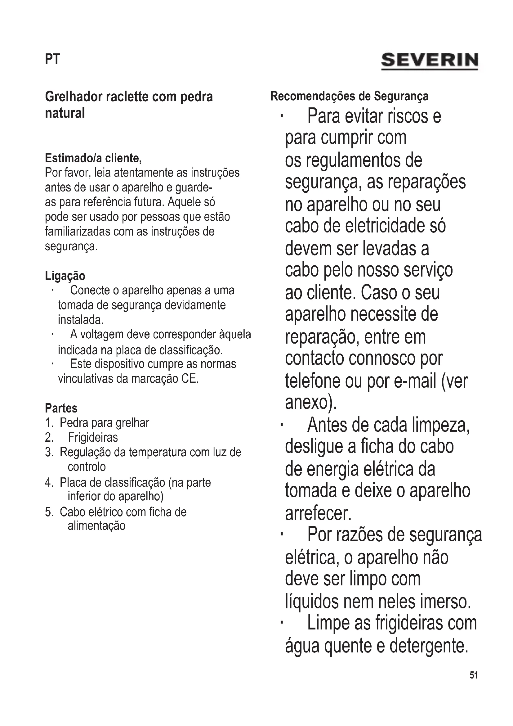 Recomendações práticas ∙ Descongele alimentos congelados antes de grelhá-los. ∙ Para proteger as superfícies das frigideiras, não utilize objetos pontiagudos. ∙ Para grandes quantidades de alimentos a serem grelhados, recomenda-se que a gordura acumulada ao grelhar seja cuidadosamente removida, vez por outra, com papel de cozinha. Limpeza e manutenção ∙ Antes de cada limpeza, desligue a cha do cabo de energia elétrica da tomada e deixe o aparelho arrefecer. ∙ Por razões de segurança elétrica, o aparelho não deve ser limpo com líquidos nem ser neles imerso. ∙ Não utilize produtos de limpeza abrasivos ou ásperos. ∙ Limpe a parte externa do aparelho com um pano húmido. ∙ Retire as frigideiras já arrefecidas e limpe-as com água quente e detergente. Em seguida, seque-as com um pano. ∙ Retire a pedra já arrefecida e limpe-a sob água corrente sem o uso de detergentes e com o auxílio de uma esponja. Em seguida, seque-a com um pano. Nunca deixe a pedra de molho em água. Eliminação Os aparelhos marcados com este símbolo devem ser eliminados separadamente dos resíduos domésticos, já que contêm materiais valiosos que podem ser reciclados. A eliminação adequada protege o ambiente e a saúde humana. As suas autoridades locais ou o revendedor podem facultar-lhe informações sobre o assunto. Garantia Nas seguintes condições, os direitos de garantia obrigatórios perante o vendedor e eventuais garantias permanecem intactos. Caso necessite de usufruir da sua garantia, contacte o comerciante diretamente. Além disso, a SEVERIN concede uma garantia de 2 anos com efeito a partir da data da compra do produto. Neste período, resolveremos qualquer defeito de fabrico ou de material que prejudique signicativamente o funcionamento do aparelho. Quaisquer outras reivindicações serão rejeitadas. Excluídos da garantia estão: Danos causados devido à não observância das instruções de uso, manuseio inadequado ou desgaste normal, bem como peças facilmente quebráveis, como, por exemplo, vidro, plástico ou lâmpadas. A garantia expira em caso de intervenção de agências não autorizadas pela SEVERIN. Se for necessária uma reparação, entre em contacto com o nosso atendimento ao cliente por telefone ou por e-mail. Os detalhes de contacto estão anexados a este manual.56 104 x 142 mm Grill „Raclette” z płytą z naturalnego kamienia Szanowni Klienci! Przed użyciem urządzenia proszę dokładnie zapoznać się z poniższą instrukcją, którą należy zachować do późniejszego wglądu. Urządzenie może być obsługiwane wyłącznie przez osoby, które zapoznały się z niniejszą instrukcją. Podłączenie do sieci zasilającej ∙ Urządzenie należy podłączać do sieci elektrycznej wyłącznie do prawidłowo zainstalowanego gniazdka z uziemieniem. ∙ Należy sprawdzić, czy napięcie sieciowe zgadza się z napięciem podanym na tabliczce znamionowej urządzenia. ∙ Niniejszy wyrób zgodny jest z obowiązującymi w UE przepisami dotyczącymi oznakowania produktu. Zestaw