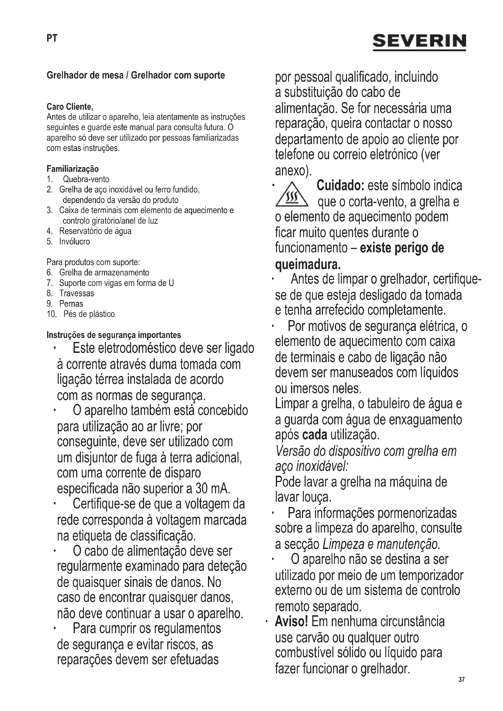 Cuidado: este símbolo indica que o corta-vento, a grelha e o elemento de aquecimento podem car muito quentes durante o funcionamento – existe perigo de queimadura. ∙ Antes de limpar o grelhador, certique- se de que esteja desligado da tomada e tenha arrefecido completamente. ∙ Por motivos de segurança elétrica, o elemento de aquecimento com caixa de terminais e cabo de ligação não devem ser manuseados com líquidos ou imersos neles. Limpar a grelha, o tabuleiro de água e a guarda com água de enxaguamento após cada utilização. Versão do dispositivo com grelha em aço inoxidável: Pode lavar a grelha na máquina de lavar louça. ∙ Para informações pormenorizadas sobre a limpeza do aparelho, consulte a secção Limpeza e manutenção. ∙ O aparelho não se destina a ser utilizado por meio de um temporizador externo ou de um sistema de controlo remoto separado. ∙ Aviso! Em nenhuma circunstância use carvão ou qualquer outro combustível sólido ou líquido para fazer funcionar o grelhador. PT38 142 x 208 mm ∙ Cuidado: Não cubra a grelha com folha de alumínio, pratos de churrasco ou outros objetos, já que a acumulação de calor resultante poderia causar danos graves na grelha. ∙ Pode colocar no máximo 1,1 litros de água no reservatório de água. ∙ Este aparelho destina-se a aplicações domésticas ou semelhantes, como em: - cozinhas para funcionários em lojas, escritórios e ambientes de trabalho semelhantes; - ambientes de trabalho agrícola; - utilização por clientes em hotéis, motéis e alojamentos similares; - ambientes do tipo “alojamento e pequeno-almoço”. ∙ Este aparelho pode ser utilizado por crianças (com pelo menos 8 anos de idade) e por pessoas com capacidades físicas, sensoriais ou mentais reduzidas ou que careçam de experiência e conhecimento, desde que sejam supervisionadas ou recebam instruções sobre a utilização do aparelho e compreendam plenamente todos os perigos e precauções de segurança envolvidos. ∙ As crianças devem ser vigiadas para assegurar que não brinquem com o aparelho. ∙ Não deve permitir que as tarefas de limpeza e manutenção sejam efetuadas por crianças, a menos que estas sejam supervisionadas e tenham pelo menos 8 anos de idade. ∙ O aparelho e o seu cabo de alimentação elétrica devem estar sempre fora do alcance das crianças com menos de 8 anos de idade. ∙ Cuidado: mantenha quaisquer materiais de embalagem bem afastados das crianças; existe risco de asxia. ∙ Sempre que utilizar o aparelho, examine meticulosamente o corpo principal, incluindo o cabo de alimentação elétrica e qualquer acessório aplicado, em busca de possíveis falhas. Se, por exemplo, o aparelho tiver caído sobre uma superfície dura ou o seu cabo de alimentação elétrica tiver sido puxado com força excessiva, não deve continuar a utilizá-lo: até mesmo os danos invisíveis podem ter efeitos adversos sobre a segurança de funcionamento do aparelho. ∙ Durante a utilização, o grelhador de churrasco deve ser colocado numa superfície nivelada, resistente ao calor e impermeável a salpicos e manchas. Ao grelhar alimentos com elevado teor de gordura ou humidade, os salpicos nem sempre são evitáveis. ∙ Não posicione o grelhador junto a uma parede ou um canto e certique-se de que não são guardados materiais inamáveis junto a ele. ∙ Não deve instalar o quebra-vento quando usar o produto em ambientes de interior. ∙ Os alimentos grelhados com gordura podem incendiar, por isso deve colocar água no compartimento de água sempre que usar o produto! Só depois é que deve ligar a cha de alimentação. Desta forma arrefece-se o reservatório de água, reduz-se o fumo e facilita-se a limpeza. ∙ Mantenha atenção ao nível da água. Deve ser acrescentada água conforme a necessidade, assegurando sempre que não entre em contacto com o elemento de aquecimento. Cuidado: desligue o grelhador da tomada antes de acrescentar água. ∙ Antes de ligar e utilizar, verique se o elemento de aquecimento está introduzido corretamente na caixa e no reservatório de água. ∙ Durante a utilização, o grelhador de churrasco deve estar permanentemente sob vigilância. ∙ A resistência e a grelha do grelhador cam muito quentes durante o funcionamento. Mesmo depois de desligar, não toque no elemento de aquecimento enquanto ainda estiver quente. Existe perigo de queimaduras! ∙ Mantenha o cabo elétrico longe de qualquer parte aquecida do aparelho. ∙ Encaminhe o cabo elétrico por forma a que ninguém possa tropeçar nele. ∙ Retire sempre a cha da tomada - antes de encher com água; - no nal de cada utilização; - no caso de mau funcionamento; - antes de limpar o aparelho.39 142 x 208 mm ∙ A utilização de uma extensão elétrica ou de um enrolador causa uma perda de potência, possivelmente combinada com uma subsequente acumulação de calor no cabo. Por conseguinte, é necessário desenrolar completamente o cabo antes da utilização. Certique-se de que o cabo esteja aprovado para utilização ao ar livre e para a potência especicada (ver a etiqueta de classicação). ∙ Para produtos com suporte: Pode colocar no máximo 4 kg sobre a grelha. ∙ Nunca mover o grelhador enquanto este estiver em funcionamento. ∙ Cuidado! Permitir sempre que o grelhador arrefeça completamente antes de o mover, limpar, cobrir ou armazenar. ∙ Cuidado! Quando o grelhador não estiver a ser utilizado, o elemento de aquecimento com caixa terminal deve ser removido do grelhador e armazenado em divisão interior seca. ∙ As restantes peças do grelhador não devem ser mantidas ao ar livre ou em locais abertos onde possam ser afetadas pelas condições meteorológicas. ∙ Declinamos qualquer responsabilidade se a avaria resultar de uso indevido, ou se não forem respeitadas as instruções. ∙ Este produto encontra-se em conformidade com todas as diretivas comunitárias referentes a rotulagem. Antes da primeira utilizaç