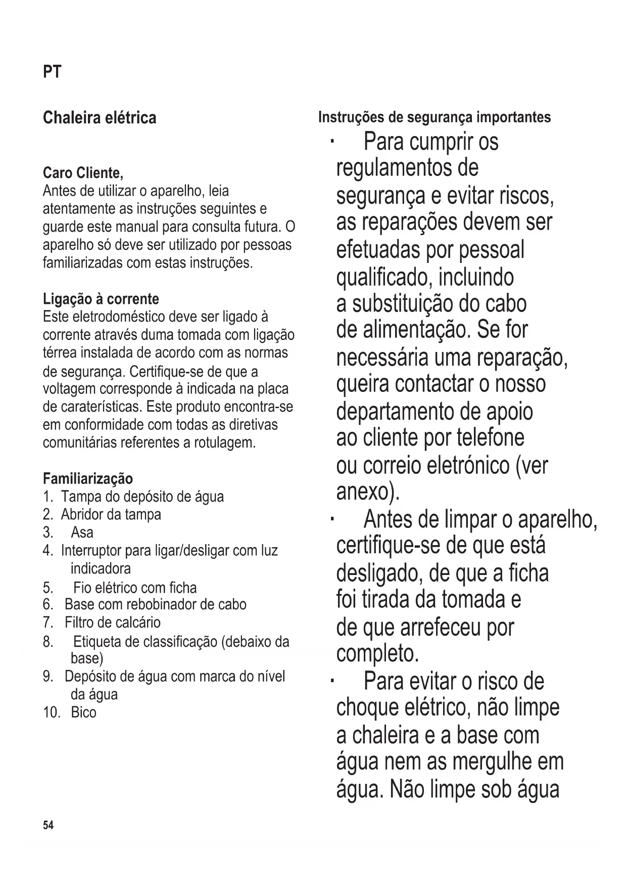 Instruções de segurança importantes ∙ Para cumprir os regulamentos de segurança e evitar riscos, as reparações devem ser efetuadas por pessoal qualicado,incluindo a substituição do cabo de alimentação. Se for necessária uma reparação, queira contactar o nosso departamento de apoio ao cliente por telefone ou correio eletrónico (ver anexo). ∙ Antes de limpar o aparelho, certique-sedequeestá desligado,dequeacha foi tirada da tomada e de que arrefeceu por completo. ∙ Para evitar o risco de choque elétrico, não limpe a chaleira e a base com água nem as mergulhe em água. Não limpe sob água PT104 x 142 mm