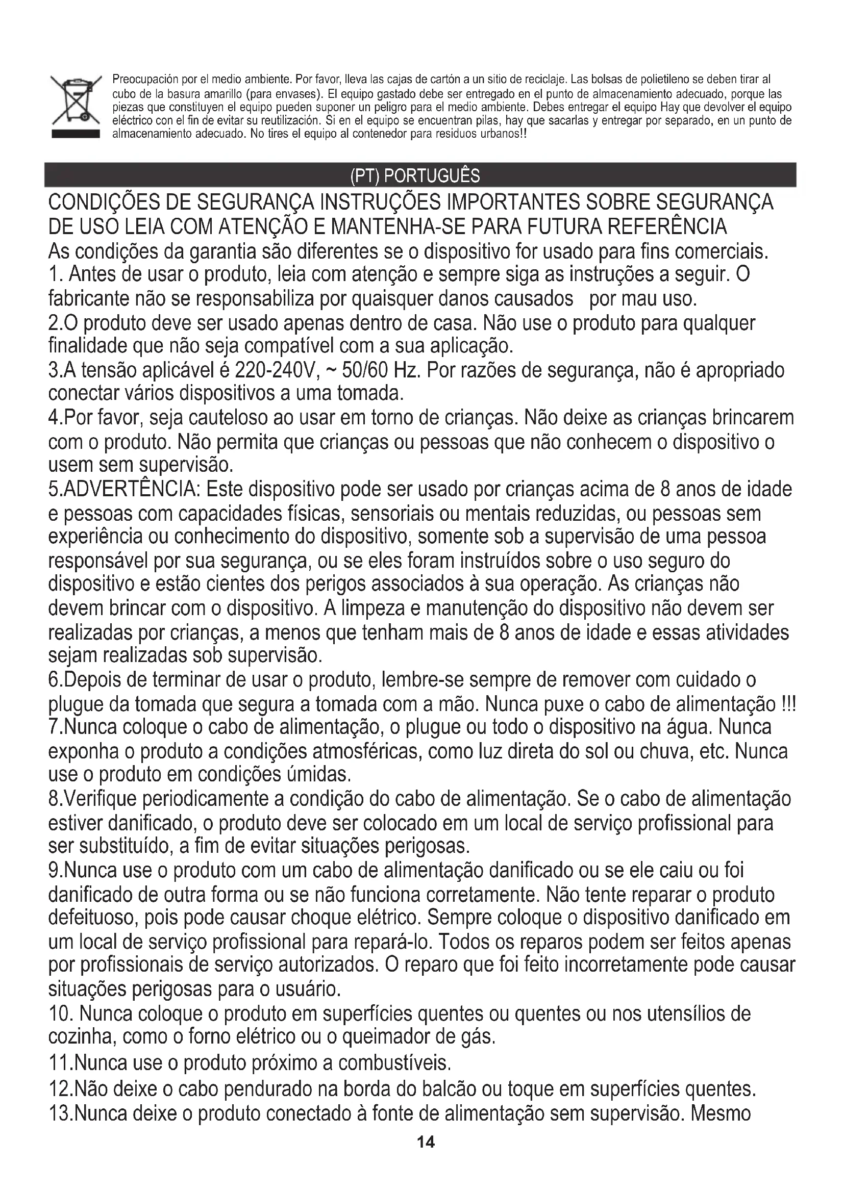 11.Nunca use o produto próximo a combustíveis. 9.Nunca use o produto com um cabo de alimentação danificado ou se ele caiu ou foi danificado de outra forma ou se não funciona corretamente. Não tente reparar o produto defeituoso, pois pode causar choque elétrico. Sempre coloque o dispositivo danificado em um local de serviço profissional para repará-lo. Todos os reparos podem ser feitos apenas por profissionais de serviço autorizados. O reparo que foi feito incorretamente pode causar situações perigosas para o usuário. 5.ADVERTÊNCIA: Este dispositivo pode ser usado por crianças acima de 8 anos de idade e pessoas com capacidades físicas, sensoriais ou mentais reduzidas, ou pessoas sem experiência ou conhecimento do dispositivo, somente sob a supervisão de uma pessoa responsável por sua segurança, ou se eles foram instruídos sobre o uso seguro do dispositivo e estão cientes dos perigos associados à sua operação. As crianças não devem brincar com o dispositivo. A limpeza e manutenção do dispositivo não devem ser realizadas por crianças, a menos que tenham mais de 8 anos de idade e essas atividades sejam realizadas sob supervisão.