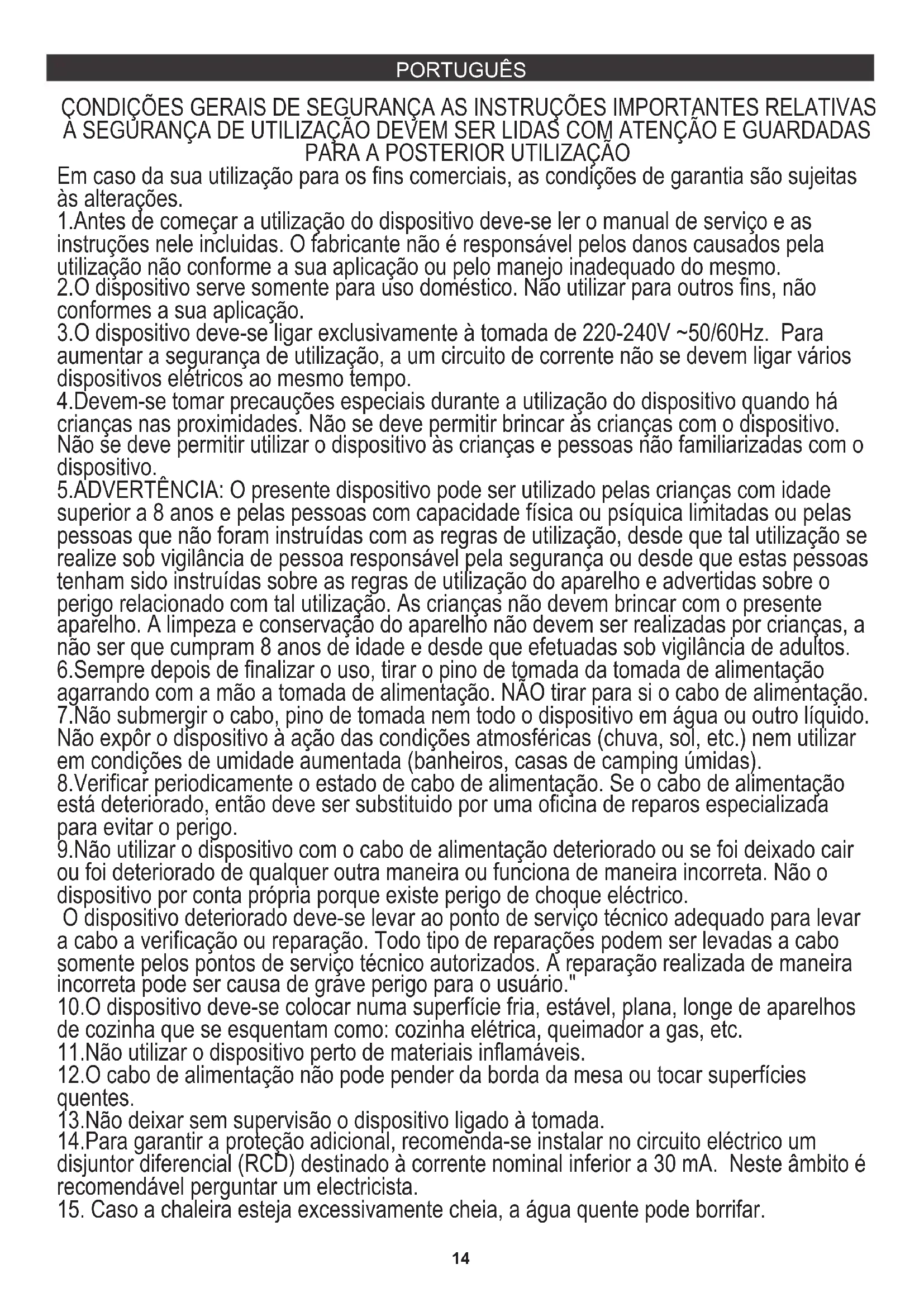 6.Sempre depois de finalizar o uso, tirar o pino de tomada da tomada de alimentação agarrando com a mão a tomada de alimentação. NÃO tirar para si o cabo de alimentação. 12.O cabo de alimentação não pode pender da borda da mesa ou tocar superfícies quentes. Em caso da sua utilização para os fins comerciais, as condições de garantia são sujeitas às alterações. 1.Antes de começar a utilização do dispositivo deve-se ler o manual de serviço e as instruções nele incluidas. O fabricante não é responsável pelos danos causados pela utilização não conforme a sua aplicação ou pelo manejo inadequado do mesmo. 2.O dispositivo serve somente para uso doméstico. Não utilizar para outros fins, não conformes a sua aplicação. 5.ADVERTÊNCIA: O presente dispositivo pode ser utilizado pelas crianças com idade superior a 8 anos e pelas pessoas com capacidade física ou psíquica limitadas ou pelas pessoas que não foram instruídas com as regras de utilização, desde que tal utilização se realize sob vigilância de pessoa responsável pela segurança ou desde que estas pessoas tenham sido instruídas sobre as regras de utilização do aparelho e advertidas sobre o perigo relacionado com tal utilização. As crianças não devem brincar com o presente aparelho. A limpeza e conservação do aparelho não devem ser realizadas por crianças, a não ser que cumpram 8 anos de idade e desde que efetuadas sob vigilância de adultos. 3.O dispositivo deve-se ligar exclusivamente à tomada de 220-240V ~50/60Hz. Para aumentar a segurança de utilização, a um circuito de corrente não se devem ligar vários dispositivos elétricos ao mesmo tempo. 4.Devem-se tomar precauções especiais durante a utilização do dispositivo quando há crianças nas proximidades. Não se deve permitir brincar às crianças com o dispositivo. Não se deve permitir utilizar o dispositivo às crianças e pessoas não familiarizadas com o dispositivo. 14.Para garantir a proteção adicional, recomenda-se instalar no circuito eléctrico um disjuntor diferencial (RCD) destinado à corrente nominal inferior a 30 mA. Neste âmbito é recomendável perguntar um electricista.