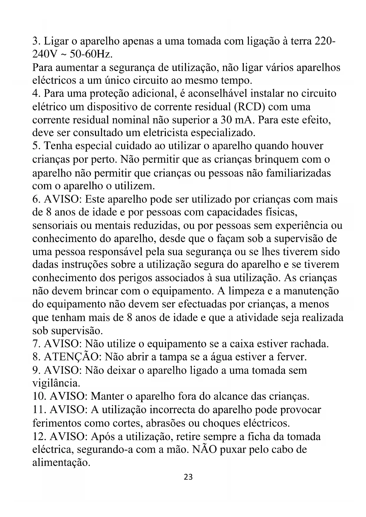 12. AVISO: Após a utilização, retire sempre a ficha da tomada