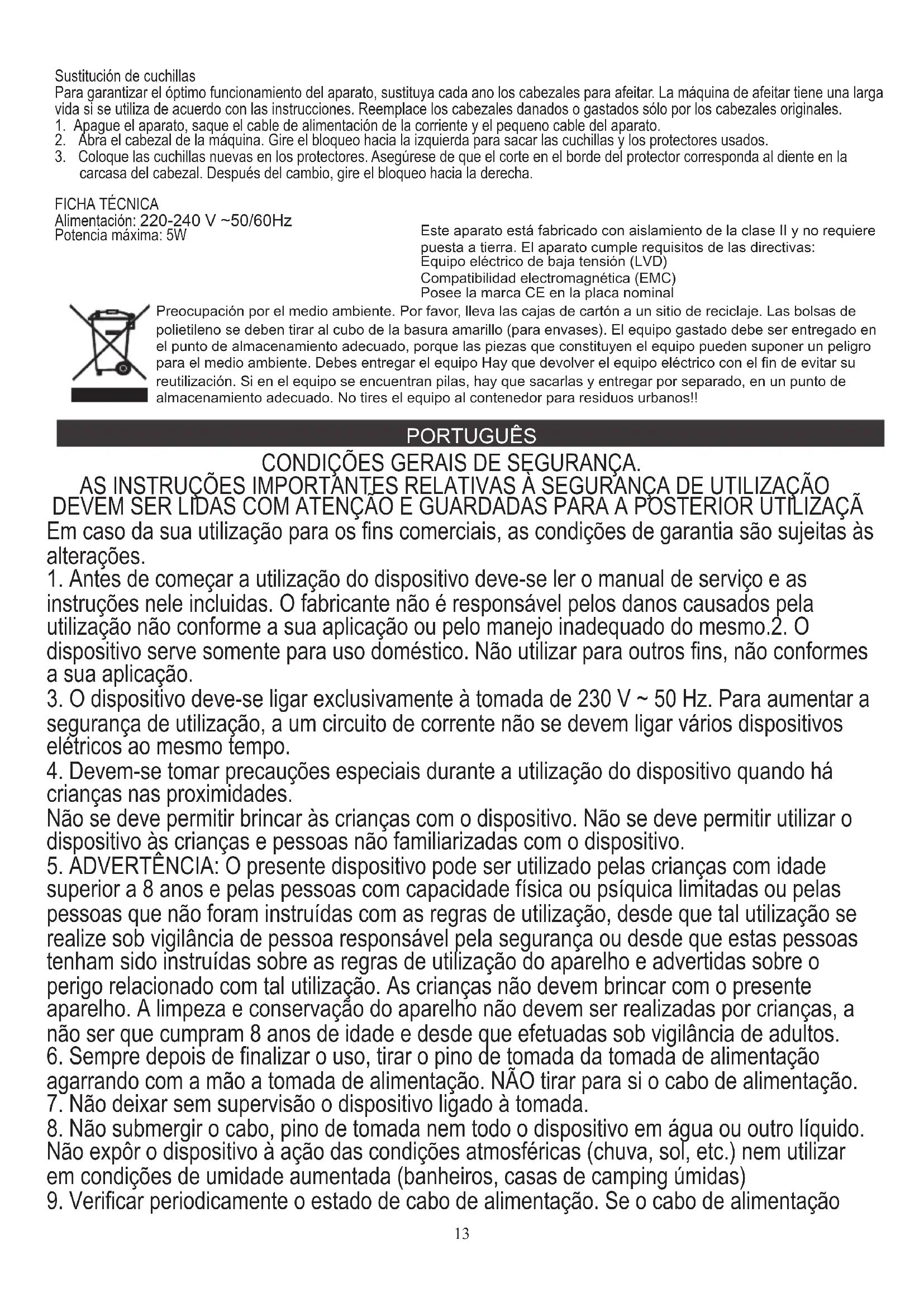 Alimentación: 220-240 V ~50/60Hz Potencia máxima: 5W 13está deteriorado, então deve ser substituido por uma oficina de reparos especializada para evitar o perigo.