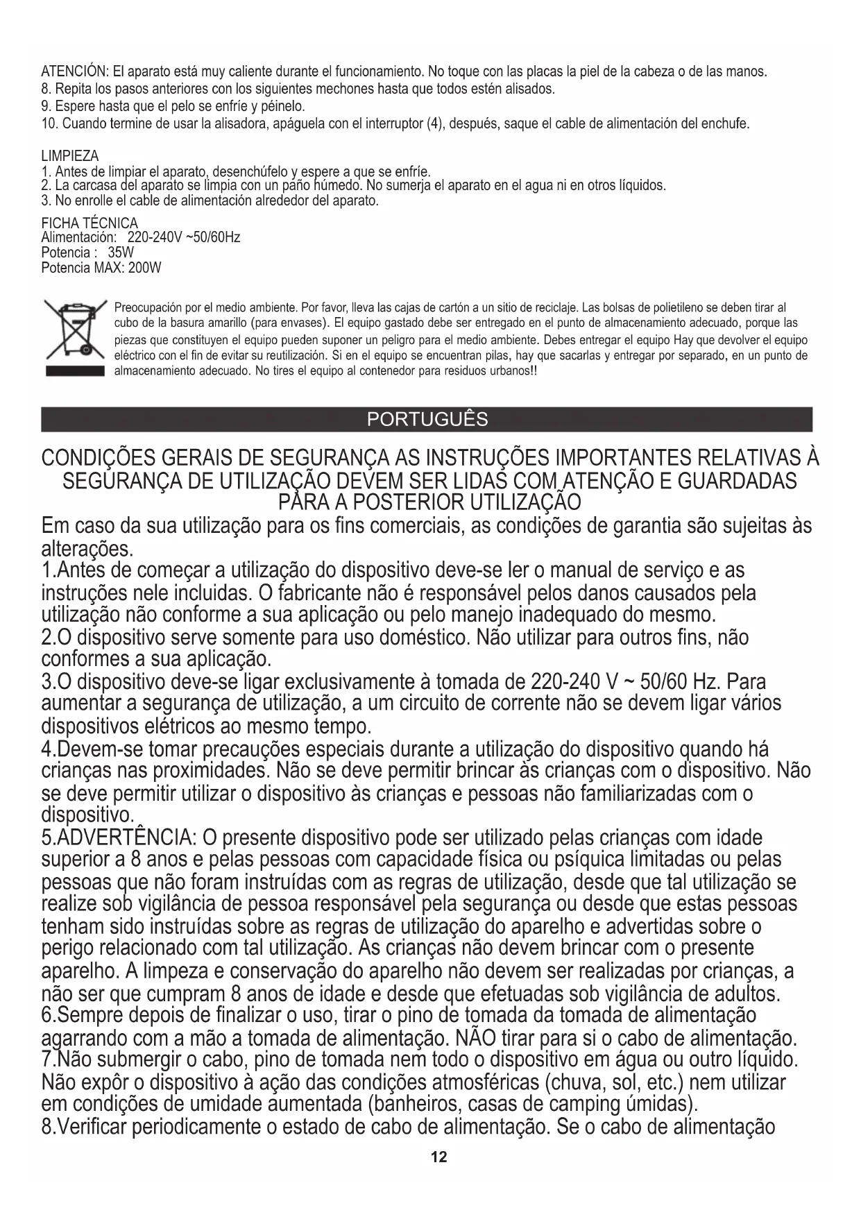 ATENCIÓN: El aparato está muy caliente durante el funcionamiento. No toque con las placas la piel de la cabeza o de las manos. Preocupación por el medio ambiente. Por favor, lleva las cajas de cartón a un sitio de reciclaje. Las bolsas de polietileno se deben tirar al cubo de la basura amarillo (para envases). El equipo gastado debe ser entregado en el punto de almacenamiento adecuado, porque las piezas que constituyen el equipo pueden suponer un peligro para el medio ambiente. Debes entregar el equipo Hay que devolver el equipo eléctrico con el fin de evitar su reutilización. Si en el equipo se encuentran pilas, hay que sacarlas y entregar por separado, en un punto de almacenamiento adecuado. No tires el equipo al contenedor para residuos urbanos!! PORTUGUÊS 8.Verificar periodicamente o estado de cabo de alimentação. Se o cabo de alimentação 1.Antes de começar a utilização do dispositivo deve-se ler o manual de serviço e as instruções nele incluidas. O fabricante não é responsável pelos danos causados pela utilização não conforme a sua aplicação ou pelo manejo inadequado do mesmo. 4.Devem-se tomar precauções especiais durante a utilização do dispositivo quando há crianças nas proximidades. Não se deve permitir brincar às crianças com o dispositivo. Não se deve permitir utilizar o dispositivo às crianças e pessoas não familiarizadas com o dispositivo. 3.O dispositivo deve-se ligar exclusivamente à tomada de 220-240 V ~ 50/60 Hz. Para aumentar a segurança de utilização, a um circuito de corrente não se devem ligar vários dispositivos elétricos ao mesmo tempo. 7.Não submergir o cabo, pino de tomada nem todo o dispositivo em água ou outro líquido. Não expôr o dispositivo à ação das condições atmosféricas (chuva, sol, etc.) nem utilizar em condições de umidade aumentada (banheiros, casas de camping úmidas). 5.ADVERTÊNCIA: O presente dispositivo pode ser utilizado pelas crianças com idade superior a 8 anos e pelas pessoas com capacidade física ou psíquica limitadas ou pelas pessoas que não foram instruídas com as regras de utilização, desde que tal utilização se realize sob vigilância de pessoa responsável pela segurança ou desde que estas pessoas tenham sido instruídas sobre as regras de utilização do aparelho e advertidas sobre o perigo relacionado com tal utilização. As crianças não devem brincar com o presente aparelho. A limpeza e conservação do aparelho não devem ser realizadas por crianças, a não ser que cumpram 8 anos de idade e desde que efetuadas sob vigilância de adultos. 2.O dispositivo serve somente para uso doméstico. Não utilizar para outros fins, não conformes a sua aplicação. 6.Sempre depois de finalizar o uso, tirar o pino de tomada da tomada de alimentação agarrando com a mão a tomada de alimentação. NÃO tirar para si o cabo de alimentação. CONDIÇÕES GERAIS DE SEGURANÇA AS INSTRUÇÕES IMPORTANTES RELATIVAS À SEGURANÇA DE UTILIZAÇÃO DEVEM SER LIDAS COM ATENÇÃO E GUARDADAS