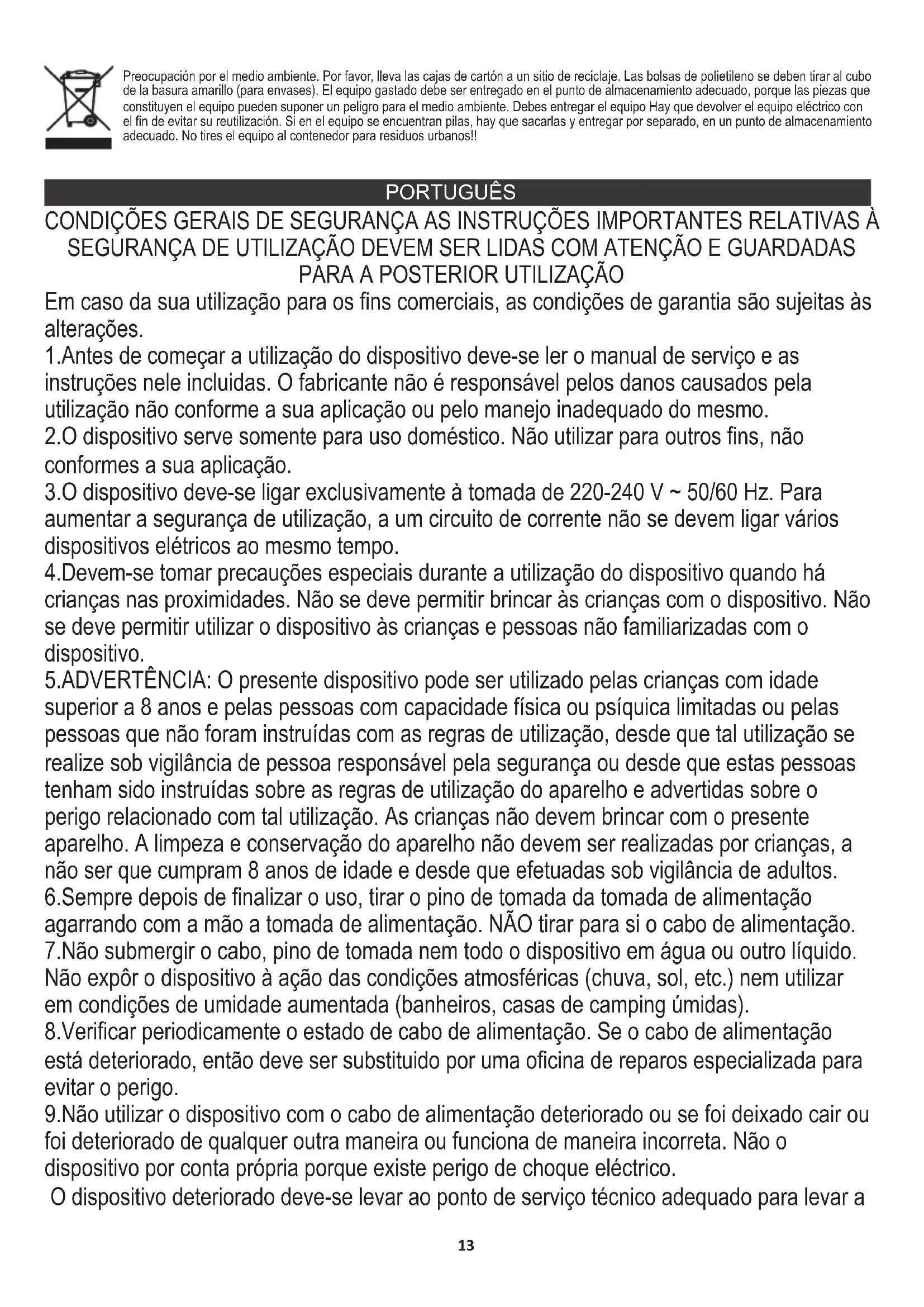 8.Verificar periodicamente o estado de cabo de alimentação. Se o cabo de alimentação está deteriorado, então deve ser substituido por uma oficina de reparos especializada para evitar o perigo. 9.Não utilizar o dispositivo com o cabo de alimentação deteriorado ou se foi deixado cair ou foi deteriorado de qualquer outra maneira ou funciona de maneira incorreta. Não o dispositivo por conta própria porque existe perigo de choque eléctrico. 4.Devem-se tomar precauções especiais durante a utilização do dispositivo quando há crianças nas proximidades. Não se deve permitir brincar às crianças com o dispositivo. Não se deve permitir utilizar o dispositivo às crianças e pessoas não familiarizadas com o dispositivo. 6.Sempre depois de finalizar o uso, tirar o pino de tomada da tomada de alimentação agarrando com a mão a tomada de alimentação. NÃO tirar para si o cabo de alimentação. Em caso da sua utilização para os fins comerciais, as condições de garantia são sujeitas às alterações. O dispositivo deteriorado deve-se levar ao ponto de serviço técnico adequado para levar a 5.ADVERTÊNCIA: O presente dispositivo pode ser utilizado pelas crianças com idade superior a 8 anos e pelas pessoas com capacidade física ou psíquica limitadas ou pelas pessoas que não foram instruídas com as regras de utilização, desde que tal utilização se realize sob vigilância de pessoa responsável pela segurança ou desde que estas pessoas tenham sido instruídas sobre as regras de utilização do aparelho e advertidas sobre o perigo relacionado com tal utilização. As crianças não devem brincar com o presente aparelho. A limpeza e conservação do aparelho não devem ser realizadas por crianças, a não ser que cumpram 8 anos de idade e desde que efetuadas sob vigilância de adultos. 1.Antes de começar a utilização do dispositivo deve-se ler o manual de serviço e as instruções nele incluidas. O fabricante não é responsável pelos danos causados pela utilização não conforme a sua aplicação ou pelo manejo inadequado do mesmo. 3.O dispositivo deve-se ligar exclusivamente à tomada de 220-240 V ~ 50/60 Hz. Para aumentar a segurança de utilização, a um circuito de corrente não se devem ligar vários dispositivos elétricos ao mesmo tempo. 7.Não submergir o cabo, pino de tomada nem todo o dispositivo em água ou outro líquido. Não expôr o dispositivo à ação das condições atmosféricas (chuva, sol, etc.) nem utilizar em condições de umidade aumentada (banheiros, casas de camping úmidas). 2.O dispositivo serve somente para uso doméstico. Não utilizar para outros fins, não conformes a sua aplicação. Preocupación por el medio ambiente. Por favor, lleva las cajas de cartón a un sitio de reciclaje. Las bolsas de polietileno se deben tirar al cubo de la basura amarillo (para envases). El equipo gastado debe ser entregado en el punto de almacenamiento adecuado, porque las piezas que constituyen el equipo pueden suponer un peligro para el medio ambiente. Debes entregar el equipo Hay que devolver el equipo eléctrico con el fin de evitar su reutilización. Si en el equipo se encuentran pilas, hay que sacarlas y entregar por separado, en un punto de almacenamiento adecuado. No tires el equipo al contenedor para residuos urbanos!!14 14.Para garantir a proteção adicional, recomenda-se instalar no circuito eléctrico um disjuntor diferencial (RCD) destinado à corrente nominal inferior a 30 mA. Neste âmbito é recomendável perguntar um electricista.