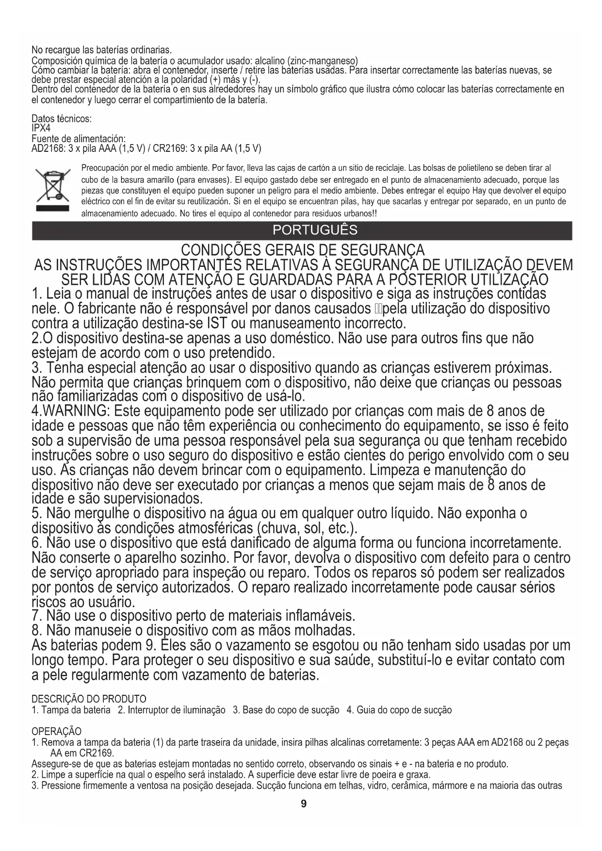 Não permita que crianças brinquem com o dispositivo, não deixe que crianças ou pessoas não familiarizadas com o dispositivo de usá-lo.10 AD2168: 3 pilhas AAA (1.5V) / CR2169: 3 pilhas AA (1.5V) Dados técnicos: Dentro do contêiner de bateria ou em sua vizinhança, há um símbolo gráfico que mostra como colocar corretamente as baterias no contêiner e, em seguida, feche o compartimento das pilhas. Fonte de alimentação: IPX4 Composição química da bateria usada ou acumulador: alcalina (zinco-manganês) Como trocar a bateria: abra o recipiente, insira / remova as baterias usadas. Para inserir adequadamente novas baterias, deve-se prestar atenção especial à polaridade (+) plus e (-).