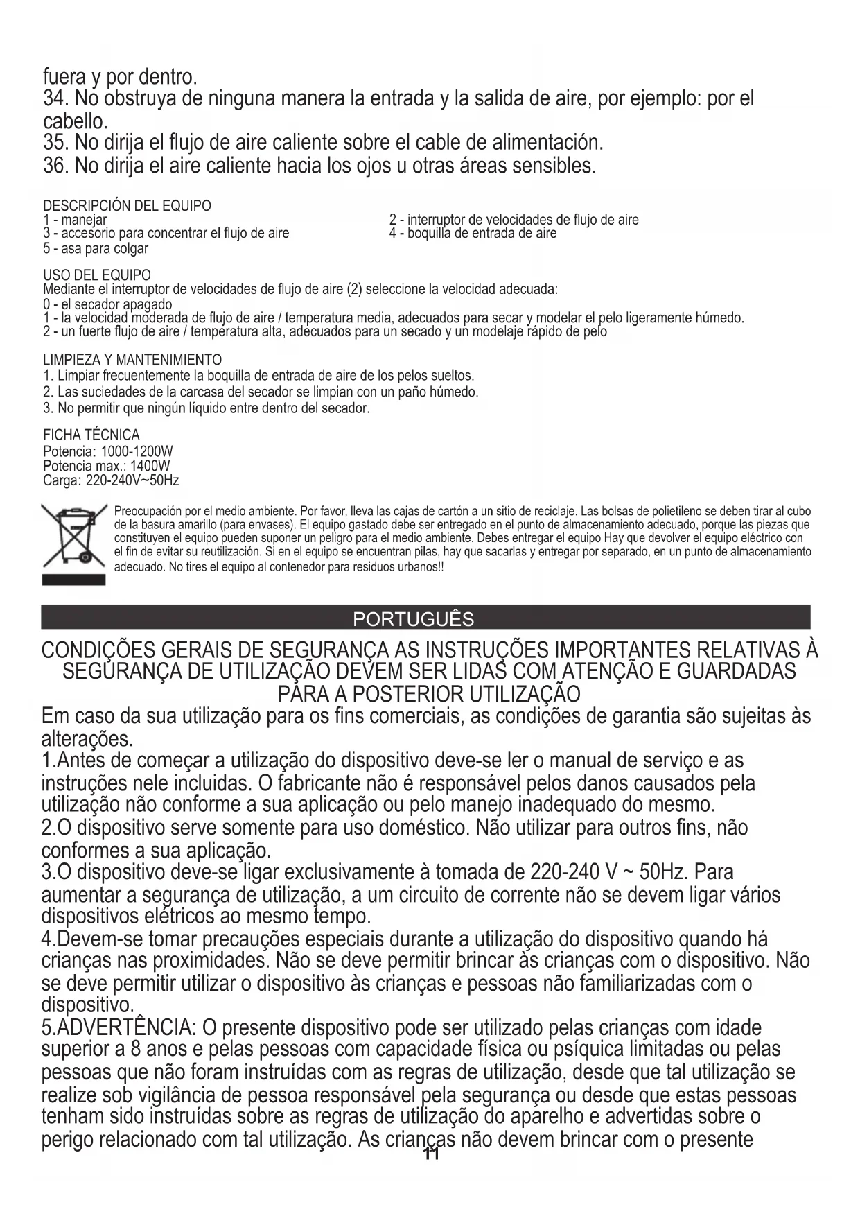 Preocupación por el medio ambiente. Por favor, lleva las cajas de cartón a un sitio de reciclaje. Las bolsas de polietileno se deben tirar al cubo de la basura amarillo (para envases). El equipo gastado debe ser entregado en el punto de almacenamiento adecuado, porque las piezas que constituyen el equipo pueden suponer un peligro para el medio ambiente. Debes entregar el equipo Hay que devolver el equipo eléctrico con el fin de evitar su reutilización. Si en el equipo se encuentran pilas, hay que sacarlas y entregar por separado, en un punto de almacenamiento adecuado. No tires el equipo al contenedor para residuos urbanos!! PORTUGUÊS 3.O dispositivo deve-se ligar exclusivamente à tomada de 220-240 V ~ 50Hz. Para aumentar a segurança de utilização, a um circuito de corrente não se devem ligar vários dispositivos elétricos ao mesmo tempo. 5.ADVERTÊNCIA: O presente dispositivo pode ser utilizado pelas crianças com idade superior a 8 anos e pelas pessoas com capacidade física ou psíquica limitadas ou pelas pessoas que não foram instruídas com as regras de utilização, desde que tal utilização se realize sob vigilância de pessoa responsável pela segurança ou desde que estas pessoas tenham sido instruídas sobre as regras de utilização do aparelho e advertidas sobre o perigo relacionado com tal utilização. As crianças não devem brincar com o presente 4.Devem-se tomar precauções especiais durante a utilização do dispositivo quando há crianças nas proximidades. Não se deve permitir brincar às crianças com o dispositivo. Não se deve permitir utilizar o dispositivo às crianças e pessoas não familiarizadas com o dispositivo. 2.O dispositivo serve somente para uso doméstico. Não utilizar para outros fins, não conformes a sua aplicação. CONDIÇÕES GERAIS DE SEGURANÇA AS INSTRUÇÕES IMPORTANTES RELATIVAS À SEGURANÇA DE UTILIZAÇÃO DEVEM SER LIDAS COM ATENÇÃO E GUARDADAS