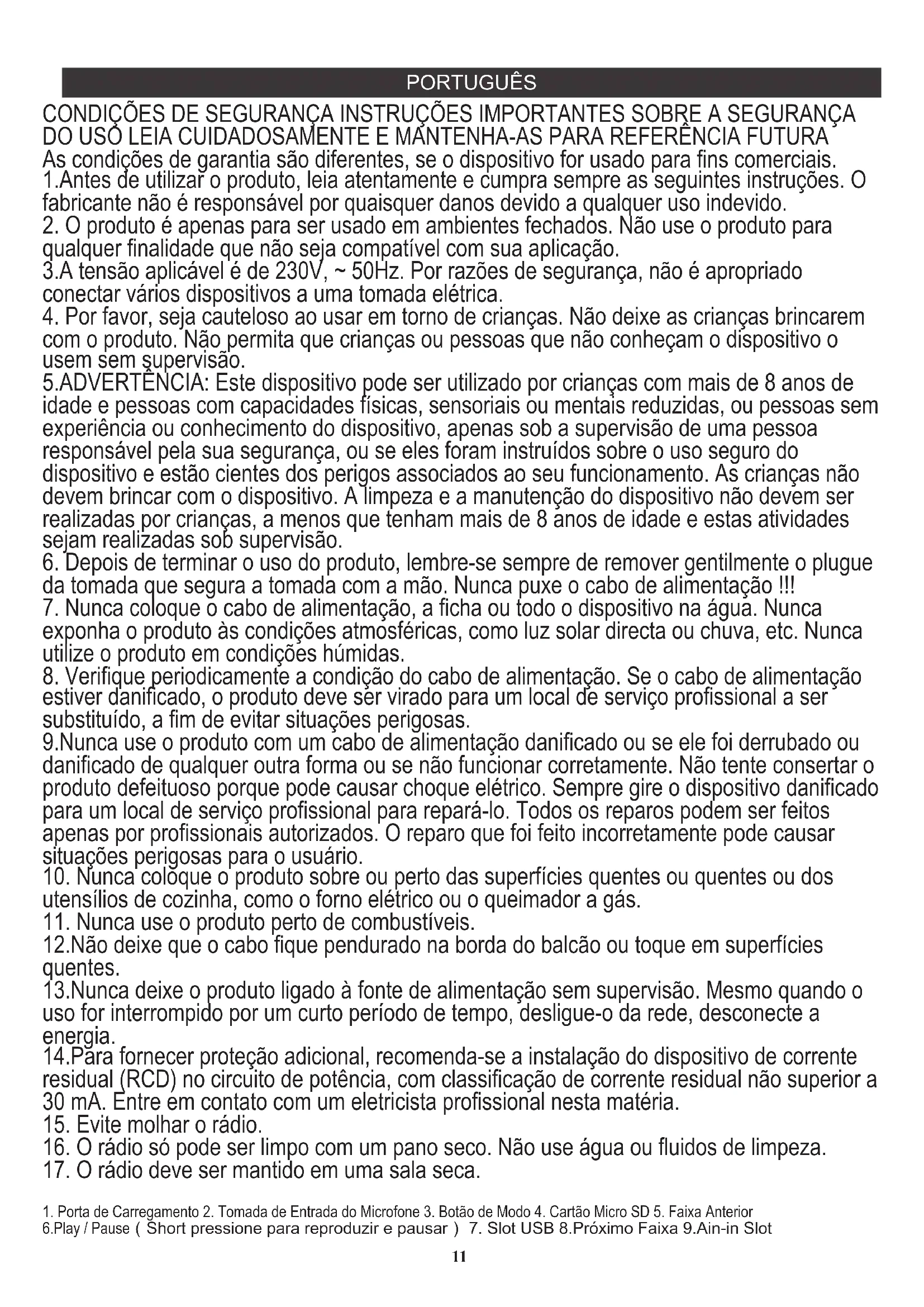 qualquer finalidade que não seja compatível com sua aplicação. 1.Antes de utilizar o produto, leia atentamente e cumpra sempre as seguintes instruções. O fabricante não é responsável por quaisquer danos devido a qualquer uso indevido. As condições de garantia são diferentes, se o dispositivo for usado para fins comerciais. CONDIÇÕES DE SEGURANÇA INSTRUÇÕES IMPORTANTES SOBRE A SEGURANÇA DO USO LEIA CUIDADOSAMENTE E MANTENHA-AS PARA REFERÊNCIA FUTURA 6.Play / Pause(Short pressione para reproduzir e pausar) 7. Slot USB 8.Próximo Faixa 9.Ain-in Slot