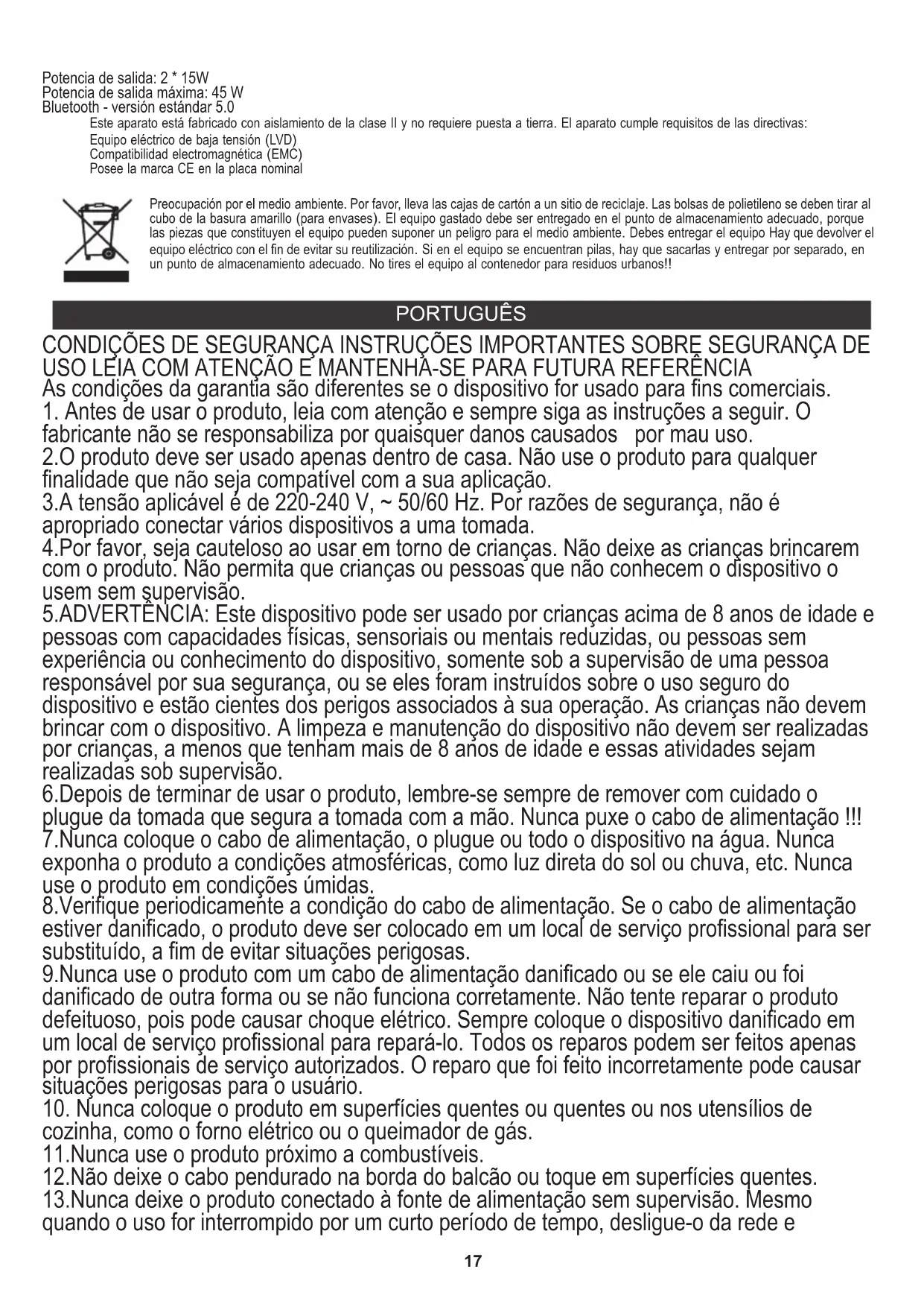 Em qualquer modo, você pode pressionar e segurar o botão [EQ] (20) e, em seguida, pressione-o rapidamente várias vezes para selecionar entre FLA T / POP / CLASSIC / ROCK / JAZZ. Dados técnicos: Tensão de entrada: 220-240V 50 / 60Hz Potência de saída: 2 * 15W Potência máxima de saída: 45W Bluetooth - versão padrão 5.0 Protecção do meio ambiente. Rogamos, os embalagens de cartão destinem-se para papéis velhos. Os sacos de polietileno (PE) devem-se colocar em contenedores para material plástico. O dispositivo usado deve-se levar a um ponto de armazenamento adequado porque os componentes perigosos que ficam dentro do dispositivo podem ser perigosos para o meio ambiente. O dispositivo elétrico deve-se entregar de modo que se reduza a sua nova utilização e uso. Se no dispositivo há pilhas, devem-se tirar e levar a um ponto de armazenamento em separado. Não colocar o dispositivo em contenedores para resíduos municipais!! Dispositivo fabricado com classe de isolamento II e não precisa de ligação à terra. Dispositivo está conforme com os requisitos das diretivas: Dispositivo elétrico de baixa voltagem (LVD) Compatibilidade eletromagnética (EMC) Produto com símbolo CE na placa de características.21 LIETUVIŲ SAUGOS SĄLYGOS SVARBIOS NAUDOJIMO SAUGOS INSTRUKCIJOS ATSAKYKITE