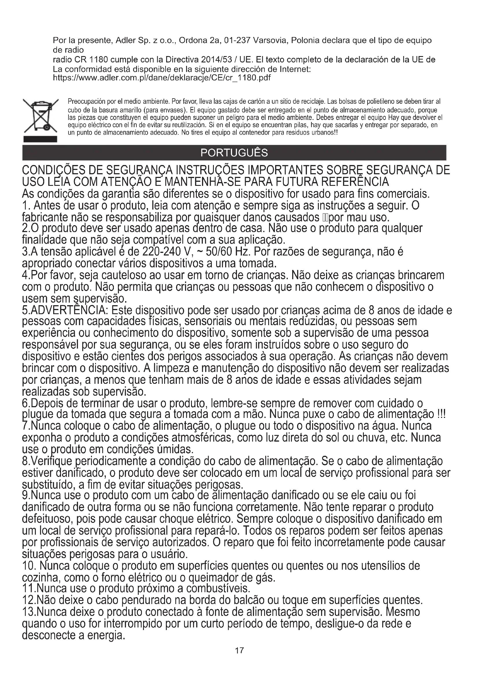 Para o manual completo explicando todos os detalhes do dispositivo, siga o link abaixo: http://www.adler.com.pl/dane/manuals/cr_1180F.pdf Protecção do meio ambiente. Rogamos, os embalagens de cartão destinem-se para papéis velhos. Os sacos de polietileno (PE) devem-se colocar em contenedores para material plástico. O dispositivo usado deve-se levar a um ponto de armazenamento adequado porque os componentes perigosos que ficam dentro do dispositivo podem ser perigosos para o meio ambiente. O dispositivo elétrico deve-se entregar de modo que se reduza a sua nova utilização e uso. Se no dispositivo há pilhas, devem-se tirar e levar a um ponto de armazenamento em separado. Não colocar o dispositivo em contenedores para resíduos municipais!! Por meio deste, Adler Sp. z o.o., Ordona 2a, 01-237 Varsóvia, Polônia declara que o tipo de equipamento de rádio o rádio CR 1180 está em conformidade com a Diretiva 2014/53 / UE. O texto completo da declaração da UE de conformidade está disponível no seguinte endereço de internet: https://www.adler.com.pl/dane/deklaracje/CE/cr_1180.pdf21 LIETUVIŲ SAUGOS SĄLYGOS SVARBIOS NAUDOJIMO SAUGOS INSTRUKCIJOS ATSAKYKITE