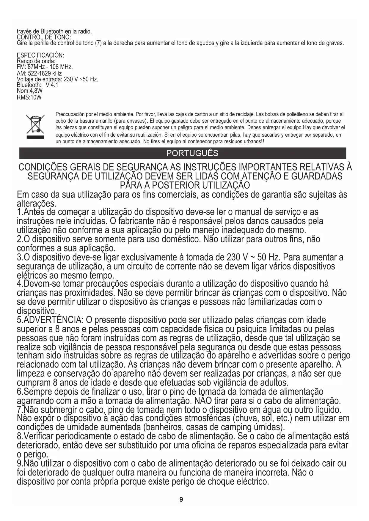 8. Seletor AM / FM / BT 9. Antena 10. Cabo de Alimentação