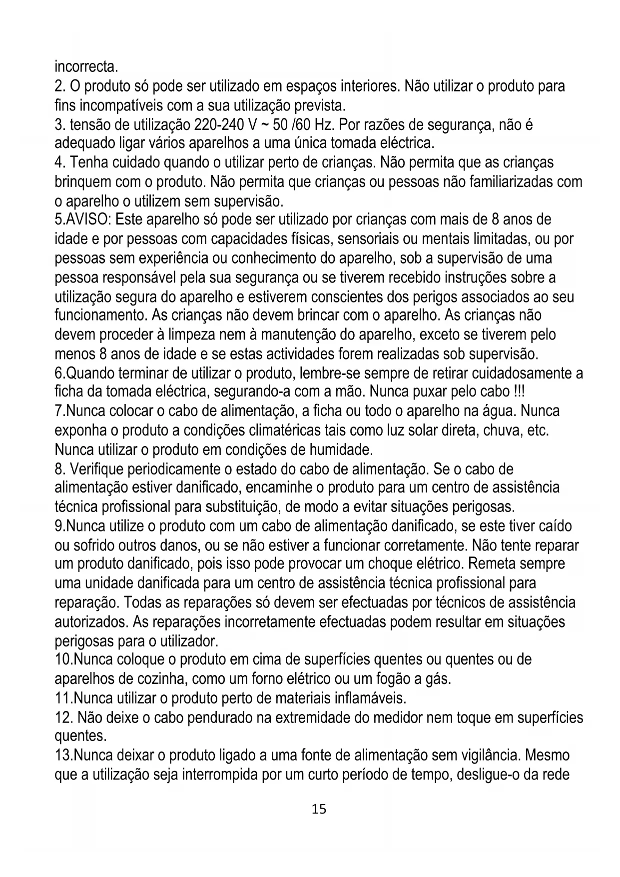 brinquem com o produto. Não permita que crianças ou pessoas não familiarizadas com o aparelho o utilizem sem supervisão. 5.AVISO: Este aparelho só pode ser utilizado por crianças com mais de 8 anos de idade e por pessoas com capacidades físicas, sensoriais ou mentais limitadas, ou por pessoas sem experiência ou conhecimento do aparelho, sob a supervisão de uma pessoa responsável pela sua segurança ou se tiverem recebido instruções sobre a utilização segura do aparelho e estiverem conscientes dos perigos associados ao seu funcionamento. As crianças não devem brincar com o aparelho. As crianças não devem proceder à limpeza nem à manutenção do aparelho, exceto se tiverem pelo menos 8 anos de idade e se estas actividades forem realizadas sob supervisão. 6.Quando terminar de utilizar o produto, lembre-se sempre de retirar cuidadosamente a ficha da tomada eléctrica, segurando-a com a mão. Nunca puxar pelo cabo !!! 7.Nunca colocar o cabo de alimentação, a ficha ou todo o aparelho na água. Nunca exponha o produto a condições climatéricas tais como luz solar direta, chuva, etc. Nunca utilizar o produto em condições de humidade.