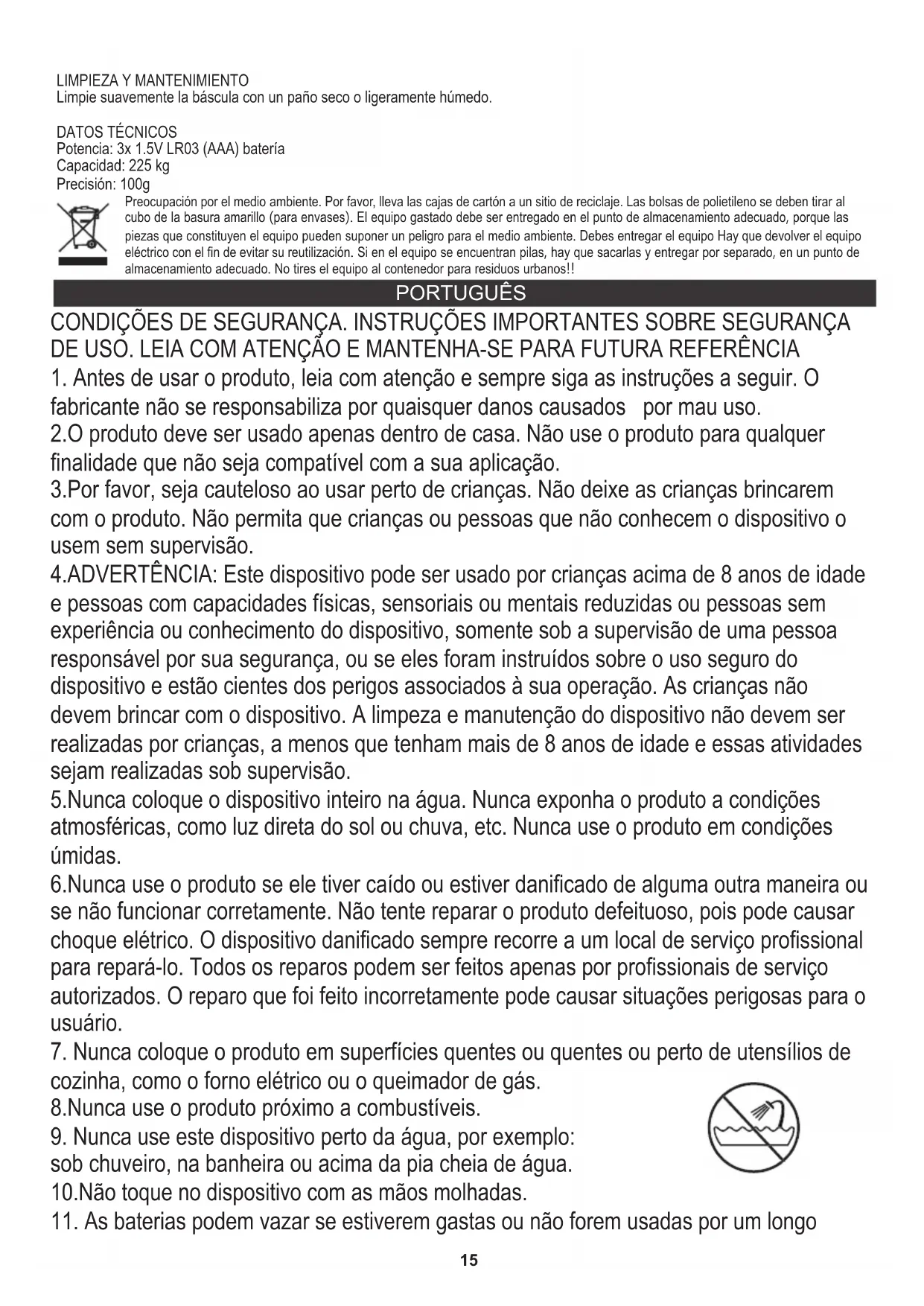 cozinha, como o forno elétrico ou o queimador de gás. 4.ADVERTÊNCIA: Este dispositivo pode ser usado por crianças acima de 8 anos de idade e pessoas com capacidades físicas, sensoriais ou mentais reduzidas ou pessoas sem experiência ou conhecimento do dispositivo, somente sob a supervisão de uma pessoa responsável por sua segurança, ou se eles foram instruídos sobre o uso seguro do dispositivo e estão cientes dos perigos associados à sua operação. As crianças não devem brincar com o dispositivo. A limpeza e manutenção do dispositivo não devem ser realizadas por crianças, a menos que tenham mais de 8 anos de idade e essas atividades sejam realizadas sob supervisão. sob chuveiro, na banheira ou acima da pia cheia de água. 5.Nunca coloque o dispositivo inteiro na água. Nunca exponha o produto a condições atmosféricas, como luz direta do sol ou chuva, etc. Nunca use o produto em condições úmidas. 10.Não toque no dispositivo com as mãos molhadas. CONDIÇÕES DE SEGURANÇA. INSTRUÇÕES IMPORTANTES SOBRE SEGURANÇA DE USO. LEIA COM ATENÇÃO E MANTENHA-SE PARA FUTURA REFERÊNCIA Preocupación por el medio ambiente. Por favor, lleva las cajas de cartón a un sitio de reciclaje. Las bolsas de polietileno se deben tirar al cubo de la basura amarillo (para envases). El equipo gastado debe ser entregado en el punto de almacenamiento adecuado, porque las piezas que constituyen el equipo pueden suponer un peligro para el medio ambiente. Debes entregar el equipo Hay que devolver el equipo eléctrico con el fin de evitar su reutilización. Si en el equipo se encuentran pilas, hay que sacarlas y entregar por separado, en un punto de almacenamiento adecuado. No tires el equipo al contenedor para residuos urbanos!! PORTUGUÊS