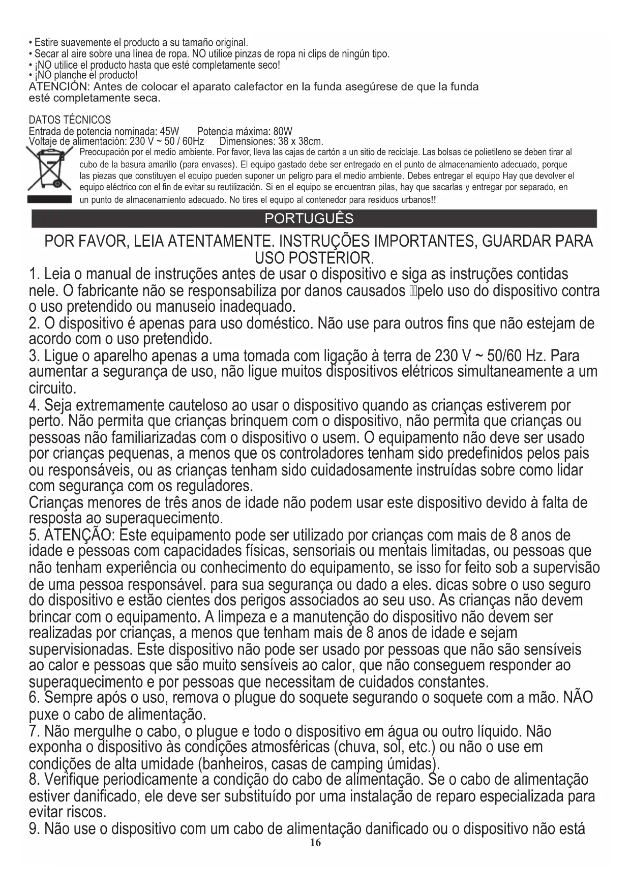 idade e pessoas com capacidades físicas, sensoriais ou mentais limitadas, ou pessoas que não tenham experiência ou conhecimento do equipamento, se isso for feito sob a supervisão de uma pessoa responsável. para sua segurança ou dado a eles. dicas sobre o uso seguro do dispositivo e estão cientes dos perigos associados ao seu uso. As crianças não devem brincar com o equipamento. A limpeza e a manutenção do dispositivo não devem ser realizadas por crianças, a menos que tenham mais de 8 anos de idade e sejam supervisionadas. Este dispositivo não pode ser usado por pessoas que não são sensíveis ao calor e pessoas que são muito sensíveis ao calor, que não conseguem responder ao superaquecimento e por pessoas que necessitam de cuidados constantes.