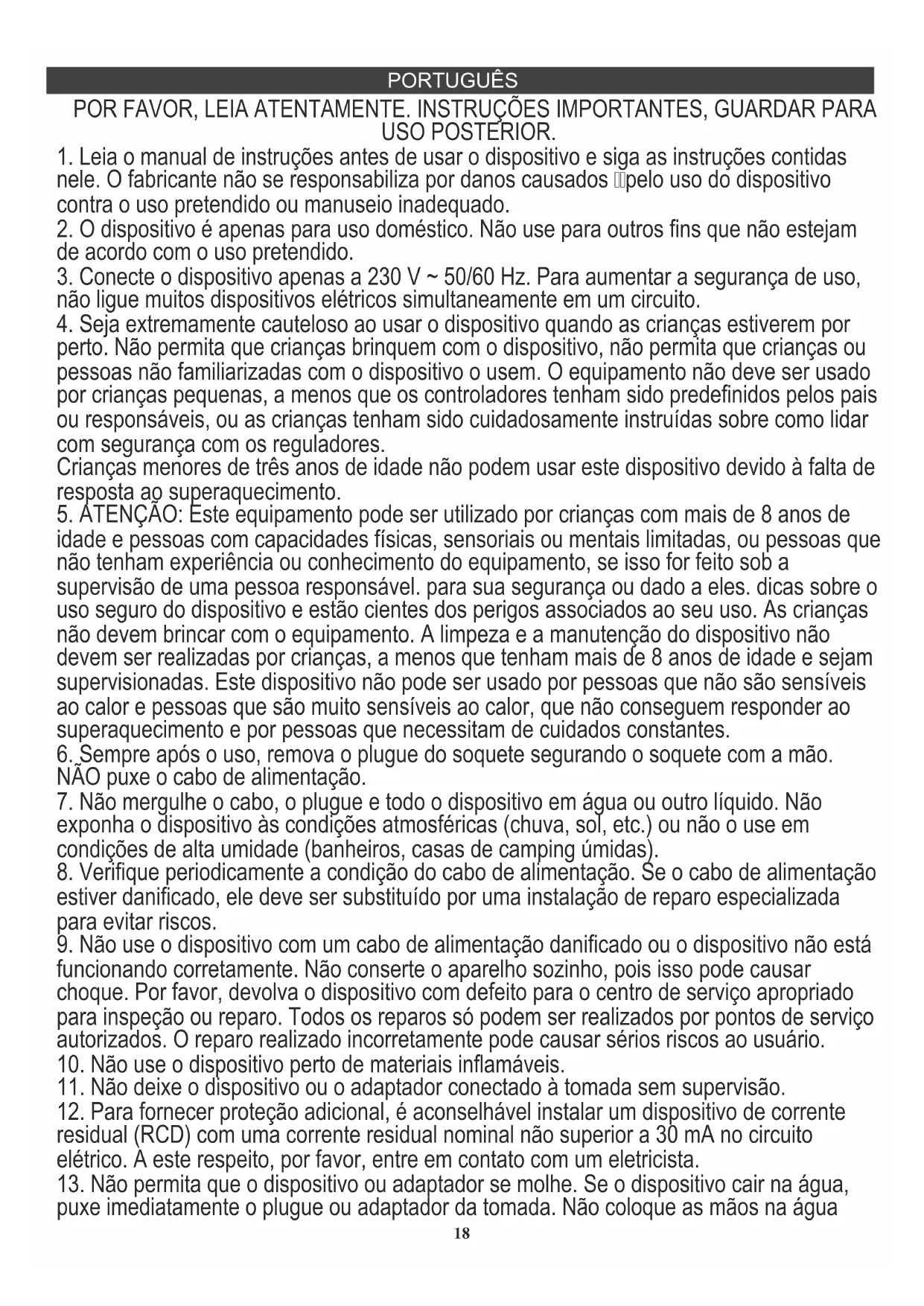 idade e pessoas com capacidades físicas, sensoriais ou mentais limitadas, ou pessoas que não tenham experiência ou conhecimento do equipamento, se isso for feito sob a supervisão de uma pessoa responsável. para sua segurança ou dado a eles. dicas sobre o uso seguro do dispositivo e estão cientes dos perigos associados ao seu uso. As crianças não devem brincar com o equipamento. A limpeza e a manutenção do dispositivo não devem ser realizadas por crianças, a menos que tenham mais de 8 anos de idade e sejam supervisionadas. Este dispositivo não pode ser usado por pessoas que não são sensíveis ao calor e pessoas que são muito sensíveis ao calor, que não conseguem responder ao superaquecimento e por pessoas que necessitam de cuidados constantes.