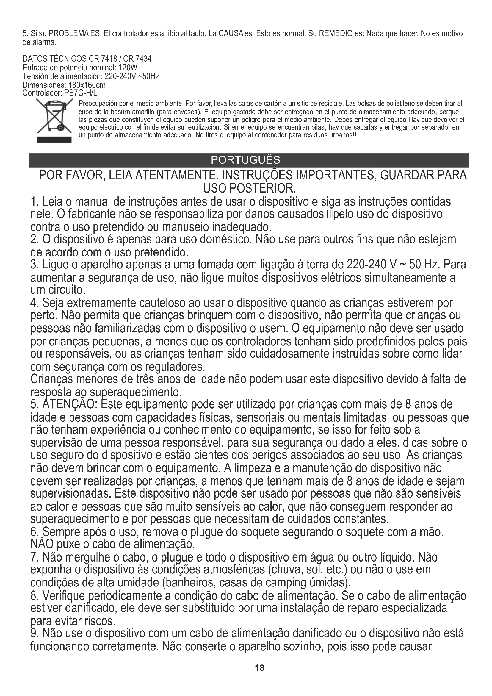 que não deve funcionar quando utilizado de acordo com a utilização prevista do equipamento. Se o fusível disparar, o dispositivo deixará de funcionar, o equipamento deverá ser devolvido ao fabricante ou seu representante para reparo. Produto: Manta elétrica de lançamento CR7418 / Cr7434 Este cobertor elétrico destina-se a ser usado como um cobertor, é para estar em cima do indivíduo e não sob eles, ou deve ser colocado acima de uma folha superior em cima da pessoa e não debaixo deles em um colchão. Não o coloque ao redor ou sob a pessoa. Ele deve permanecer solto para não proibir o movimento do usuário. Não cubra o controlador e não exerça pressão sobre o controlador.