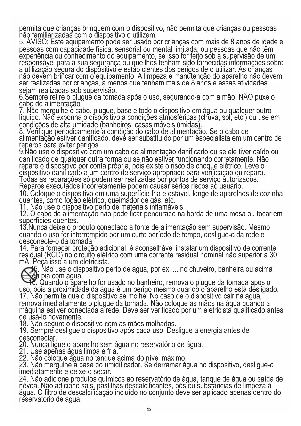 23. Não mergulhe a base do umidificador. Se derramar água no dispositivo, desligue-o