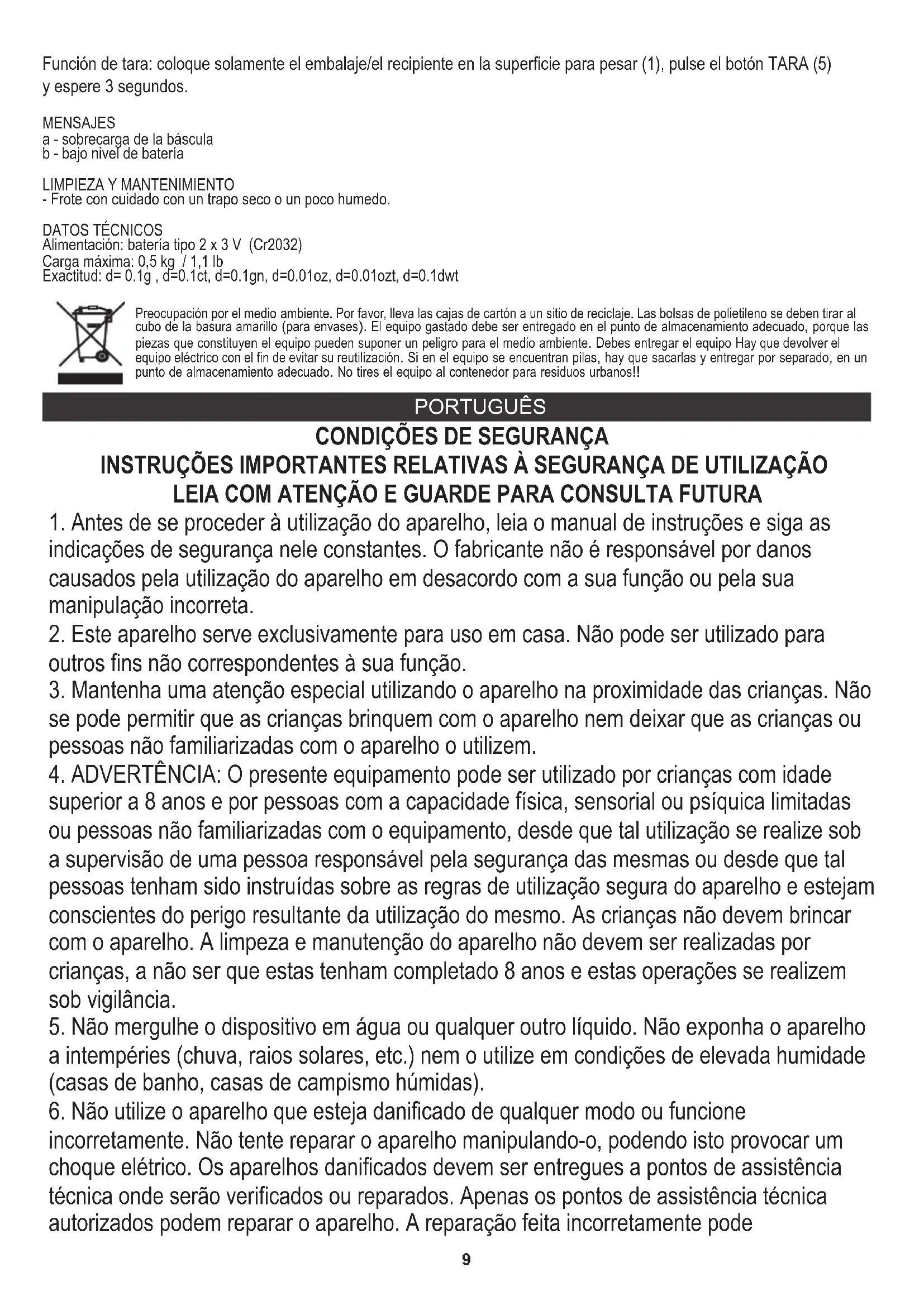 PESAGEM Alimentação: 2 pilhas x 3 V (Cr2032) Coloque um objeto a pesar na superfície de pesagem (1). Espere um instante até o resultado se estabilizar. Capacidade: 0,5 kg / 1,1lb a - balança sobrecarregada - Limpe a balança com um pano seco ou ligeiramente húmido. COMUNICAÇÕES Retire a tampa do compartimento das pilhas que se encontra no fundo da balança. Retire a pilha esgotada. Coloque uma nova pilha do tipo adequado. Feche a tampa do compartimento das pilhas. SELEÇÃO DAS UNIDADES DE MEDIÇÃO Função de tarar: coloque uma embalagem/um recipiente vazio na superfície de pesagem (1). Prima o botão TARA (5) e espere 3 segundos.