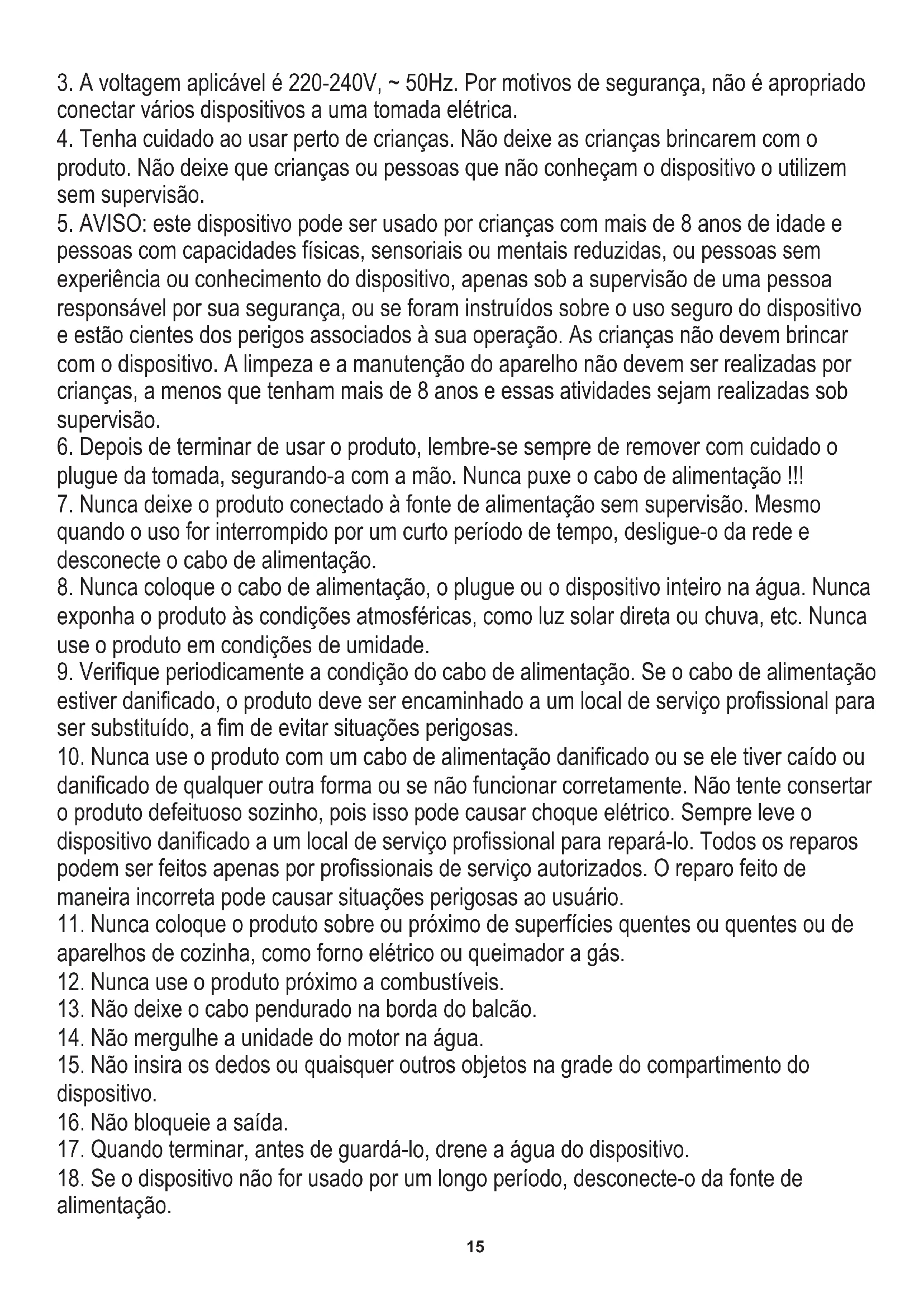 pessoas com capacidades físicas, sensoriais ou mentais reduzidas, ou pessoas sem experiência ou conhecimento do dispositivo, apenas sob a supervisão de uma pessoa responsável por sua segurança, ou se foram instruídos sobre o uso seguro do dispositivo e estão cientes dos perigos associados à sua operação. As crianças não devem brincar com o dispositivo. A limpeza e a manutenção do aparelho não devem ser realizadas por crianças, a menos que tenham mais de 8 anos e essas atividades sejam realizadas sob supervisão.