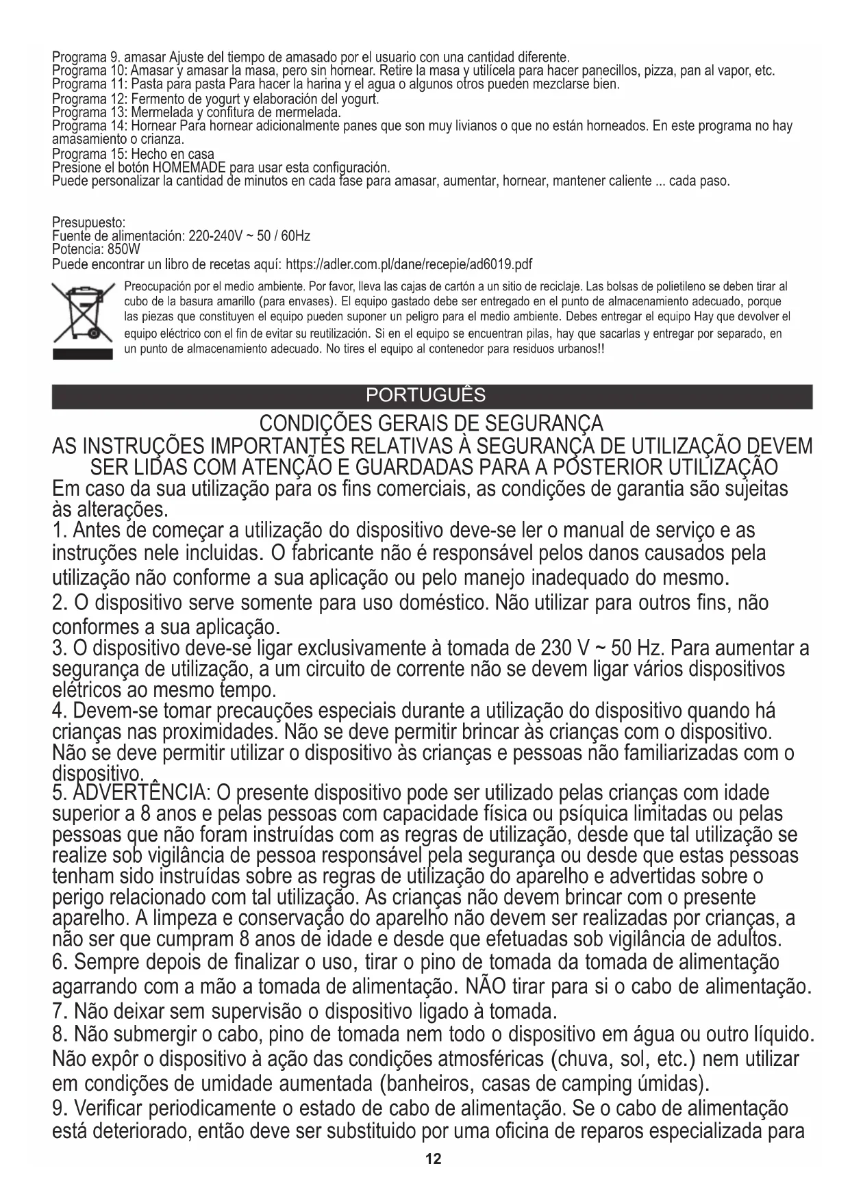 Programa 1: Básico Para pães brancos e mistos, consiste principalmente de farinha de trigo ou farinha de centeio. O pão tem uma consistência compacta. Você pode ajustar o pão marrom, definindo o botão COLOR. Programa 9. Amassar Definir o tempo de amassamento por usuário com qty diferente. Programa 3: Trigo Integral Para pães com variedades pesadas de farinha que requerem uma fase mais longa de amassamento e levedação (por exemplo, farinha de trigo integral e farinha de centeio). O pão será mais compacto e pesado. Programa 4: Doce Para pães com aditivos, como sucos de frutas, coco ralado, passas, frutas secas, chocolate ou açúcar adicionado. Devido a uma fase mais longa de subida, o pão será leve e arejado. Programa 5: Leite Manteiga Pão Amassar, levantar e fazer pão com manteiga e leite para fazer pão. Programa 6: Sem glúten Amassar, levantar e assar pão sem glúten. Normalmente para: farinha sem glúten, farinha de arroz, farinha de batata doce, farinha de milho e farinha de aveia. Programa 7: Super rápido Amassar, levantar e assar pão dentro do tempo inferior ao pão básico. Mas o pão assado neste cenário é geralmente menor com uma textura densa. Programa 8: Bolo Amassar, levantar e assar, mas subir com refrigerante ou fermento em pó. Programa 13: compotas e marmelada. Programa 10: Massa Amassar e subir, mas sem fermento. Retire a massa e use para fazer pães, pizza, pão cozido no vapor, etc. Programa 11: Massa de massa Para fazer a farinha e a água, ou outras, pode comê-lo bem. Programa 12: Iogurte Ferment e faça o iogurte. Programa 14: Assar Para assar outros pães muito leves ou não assados. Neste programa não há amassar ou levantar. Programa 15: Caseiro Pressione o botão HOMEMADE para usar esta configuração. Você pode personalizar quantos minutos em cada fase para amassar, levantar, assar, manter aquecido ... a cada passo. Especificações: Fonte de alimentação: 220-240V ~ 50 / 60Hz Potência: 850W Você pode encontrar um livro de receitas aqui: https://adler.com.pl/dane/recepie/ad6019.pdf Protecção do meio ambiente. Rogamos, os embalagens de cartão destinem-se para papéis velhos. Os sacos de polietileno (PE) devem-se colocar em contenedores para material plástico. O dispositivo usado deve-se levar a um ponto de armazenamento adequado porque os componentes perigosos que ficam dentro do dispositivo podem ser perigosos para o meio ambiente. O dispositivo elétrico deve-se entregar de modo que se reduza a sua nova utilização e uso. Se no dispositivo há pilhas, devem-se tirar e levar a um ponto de armazenamento em separado. Não colocarodispositivoemcontenedores para resíduos municipais LIETUVIŲ BENDROSIOS SAUGOS SĄLYGOS SVARBIAS SAUGAUS NAUDOJIMO INSTRUKCIJAS BŪTINA ATIDŽIAI PERSKAITYTI IR IŠSAUGOTI ATEIČIAI Jeigu prietaisas naudojama komerciniais tikslais, taikomos kitokios garantijos sąlygos. 1.Prieš pradedant naudoti prietaisą būtina perskaityti naudojimo instrukciją ir vadovautis joje pateikiamais nurodymais. Gamintojas neatsako už žalą, padarytą naudojant prietaisą ne pagal jo paskirti ar netinkamai jį naudojant. 2.Prietaisas skirtas naudoti tik namų ūkyje. Nenaudoti kitiems tikslams, neatitinkantiems jo paskirties. 3.Prietaisą galima jungti tik į 230 V ~ 50 Hz. Naudojimo saugai padidinti į vieną srovės grandinę vienu metu nejungti kelių elektros prietaisų. 4.Būtina imtis ypatingo atsargumo naudojantis prietaisu, kai šalia yra vaikų. Neleisti vaikams žaisti su prietaisu. Neleisti vaikams ar prietaiso neišmanantiems asmenims juo naudotis. 5.SPĖJIMAS: Šis prietaisas gali būti naudojamas vyresnių nei 8 metų amžiaus vaikų ir15