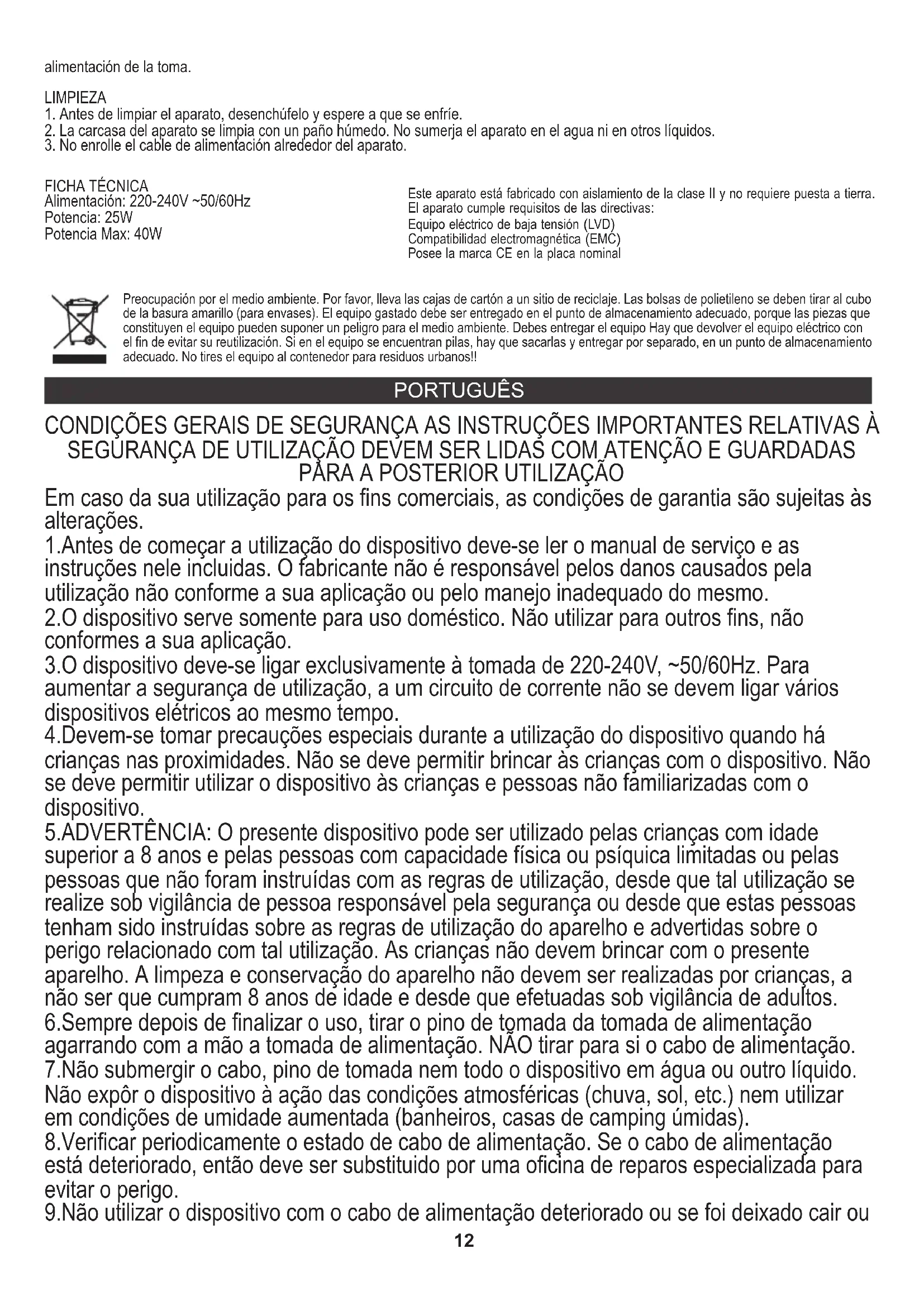 Alimentación: 220-240V ~50/60Hz Potencia: 25W Preocupación por el medio ambiente. Por favor, lleva las cajas de cartón a un sitio de reciclaje. Las bolsas de polietileno se deben tirar al cubo de la basura amarillo (para envases). El equipo gastado debe ser entregado en el punto de almacenamiento adecuado, porque las piezas que constituyen el equipo pueden suponer un peligro para el medio ambiente. Debes entregar el equipo Hay que devolver el equipo eléctrico con el fin de evitar su reutilización. Si en el equipo se encuentran pilas, hay que sacarlas y entregar por separado, en un punto de almacenamiento adecuado. No tires el equipo al contenedor para residuos urbanos!! PORTUGUÊS Equipo eléctrico de baja tensión (LVD) Este aparato está fabricado con aislamiento de la clase II y no requiere puesta a tierra. El aparato cumple requisitos de las directivas: Compatibilidad electromagnética (EMC) Posee la marca CE en la placa nominal 1.Antes de começar a utilização do dispositivo deve-se ler o manual de serviço e as instruções nele incluidas. O fabricante não é responsável pelos danos causados pela utilização não conforme a sua aplicação ou pelo manejo inadequado do mesmo. 3.O dispositivo deve-se ligar exclusivamente à tomada de 220-240V, ~50/60Hz. Para aumentar a segurança de utilização, a um circuito de corrente não se devem ligar vários dispositivos elétricos ao mesmo tempo. 4.Devem-se tomar precauções especiais durante a utilização do dispositivo quando há crianças nas proximidades. Não se deve permitir brincar às crianças com o dispositivo. Não se deve permitir utilizar o dispositivo às crianças e pessoas não familiarizadas com o dispositivo. 5.ADVERTÊNCIA: O presente dispositivo pode ser utilizado pelas crianças com idade superior a 8 anos e pelas pessoas com capacidade física ou psíquica limitadas ou pelas pessoas que não foram instruídas com as regras de utilização, desde que tal utilização se realize sob vigilância de pessoa responsável pela segurança ou desde que estas pessoas tenham sido instruídas sobre as regras de utilização do aparelho e advertidas sobre o perigo relacionado com tal utilização. As crianças não devem brincar com o presente aparelho. A limpeza e conservação do aparelho não devem ser realizadas por crianças, a não ser que cumpram 8 anos de idade e desde que efetuadas sob vigilância de adultos. 6.Sempre depois de finalizar o uso, tirar o pino de tomada da tomada de alimentação agarrando com a mão a tomada de alimentação. NÃO tirar para si o cabo de alimentação. 8.Verificar periodicamente o estado de cabo de alimentação. Se o cabo de alimentação está deteriorado, então deve ser substituido por uma oficina de reparos especializada para evitar o perigo. Em caso da sua utilização para os fins comerciais, as condições de garantia são sujeitas às alterações. CONDIÇÕES GERAIS DE SEGURANÇA AS INSTRUÇÕES IMPORTANTES RELATIVAS À SEGURANÇA DE UTILIZAÇÃO DEVEM SER LIDAS COM ATENÇÃO E GUARDADAS