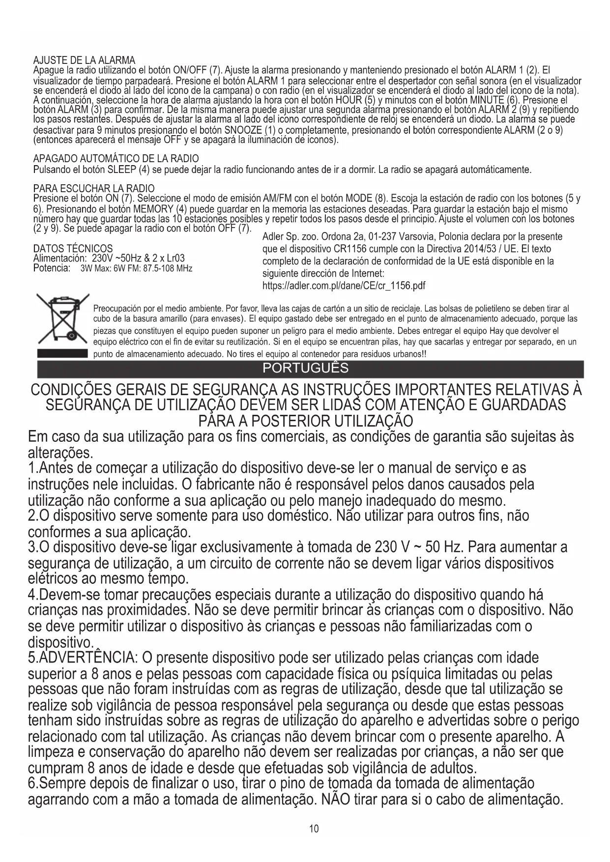 Em caso da sua utilização para os fins comerciais, as condições de garantia são sujeitas às alterações. 1.Antes de começar a utilização do dispositivo deve-se ler o manual de serviço e as instruções nele incluidas. O fabricante não é responsável pelos danos causados pela utilização não conforme a sua aplicação ou pelo manejo inadequado do mesmo. 2.O dispositivo serve somente para uso doméstico. Não utilizar para outros fins, não conformes a sua aplicação. 3.O dispositivo deve-se ligar exclusivamente à tomada de 230 V ~ 50 Hz. Para aumentar a segurança de utilização, a um circuito de corrente não se devem ligar vários dispositivos elétricos ao mesmo tempo. 5.ADVERTÊNCIA: O presente dispositivo pode ser utilizado pelas crianças com idade superior a 8 anos e pelas pessoas com capacidade física ou psíquica limitadas ou pelas pessoas que não foram instruídas com as regras de utilização, desde que tal utilização se realize sob vigilância de pessoa responsável pela segurança ou desde que estas pessoas tenham sido instruídas sobre as regras de utilização do aparelho e advertidas sobre o perigo relacionado com tal utilização. As crianças não devem brincar com o presente aparelho. A limpeza e conservação do aparelho não devem ser realizadas por crianças, a não ser que cumpram 8 anos de idade e desde que efetuadas sob vigilância de adultos. 6.Sempre depois de finalizar o uso, tirar o pino de tomada da tomada de alimentação agarrando com a mão a tomada de alimentação. NÃO tirar para si o cabo de alimentação. 4.Devem-se tomar precauções especiais durante a utilização do dispositivo quando há crianças nas proximidades. Não se deve permitir brincar às crianças com o dispositivo. Não se deve permitir utilizar o dispositivo às crianças e pessoas não familiarizadas com o dispositivo. Adler Sp. zoo. Ordona 2a, 01-237 Varsovia, Polonia declara por la presente que el dispositivo CR1156 cumple con la Directiva 2014/53 / UE. El texto completo de la declaración de conformidad de la UE está disponible en la siguiente dirección de Internet: https://adler.com.pl/dane/CE/cr_1156.pdf11 9.Não utilizar o dispositivo com o cabo de alimentação deteriorado ou se foi deixado cair ou foi deteriorado de qualquer outra maneira ou funciona de maneira incorreta. Não o dispositivo por conta própria porque existe perigo de choque eléctrico. O dispositivo deteriorado deve-se levar ao ponto de serviço técnico adequado para levar a cabo a verificação ou reparação. Todo tipo de reparações podem ser levadas a cabo somente pelos pontos de serviço técnico autorizados. A reparação realizada de maneira incorreta pode ser causa de grave perigo para o usuário. 7.Não submergir o cabo, pino de tomada nem todo o dispositivo em água ou outro líquido. Não expôr o dispositivo à ação das condições atmosféricas (chuva, sol, etc.) nem utilizar em condições de umidade aumentada (banheiros, casas de camping úmidas). 8.Verificar periodicamente o estado de cabo de alimentação. Se o cabo de alimentação está deteriorado, então deve ser substituido por uma oficina de reparos especializada para evitar o perigo. 14.Para garantir a proteção adicional, recomenda-se instalar no circuito eléctrico um disjuntor diferencial (RCD) destinado à corrente nominal inferior a 30 mA. Neste âmbito é recomendável perguntar um electricista. 10.O dispositivo deve-se colocar numa superfície fria, estável, plana, longe de aparelhos de cozinha que se esquentam como: cozinha elétrica, queimador a gas, etc. 11.Não utilizar o dispositivo perto de materiais inflamáveis. 12.O cabo de alimentação não pode pender da borda da mesa ou tocar superfícies quentes. 13.Não deixar sem supervisão o dispositivo ligado à tomada.