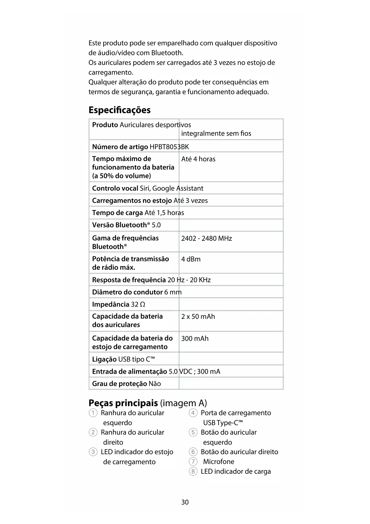 Guia de iniciação rápida Auriculares desportivos integralmente sem os HPBT8053BKPara mais informações, consulte a versão alargada do manual on-line: ned.is/hpbt8053bk Utilização prevista O HPBT8053BK da Nedis é um par de auriculares integralmente sem os.Com ganchos auriculares para um conforto e ajuste perfeitos durante as atividades desportivas.30 Este produto pode ser emparelhado com qualquer dispositivo de áudio/vídeo com Bluetooth. Os auriculares podem ser carregados até 3 vezes no estojo de carregamento. Qualquer alteração do produto pode ter consequências em termos de segurança, garantia e funcionamento adequado. Especicações Produto Auriculares desportivos integralmente sem os Número de artigo HPBT8053BK Tempo máximo de funcionamento da bateria (a 50% do volume) Até 4 horas Controlo vocal Siri, Google Assistant Carregamentos no estojo Até 3 vezes Tempo de carga Até 1,5 horas Versão Bluetooth® 5.0 Gama de frequências Bluetooth® 2402 - 2480 MHz Potência de transmissão de rádio máx. 4 dBm Resposta de frequência 20 Hz - 20 KHz Diâmetro do condutor 6 mm Impedância 32 Ω Capacidade da bateria dos auriculares 2 x 50 mAh Capacidade da bateria do estojo de carregamento 300 mAh Ligação USB tipo C™ Entrada de alimentação 5.0 VDC ; 300 mA Grau de proteção Não Peças principais (imagem A) 1 Ranhura do auricular esquerdo 2 Ranhura do auricular direito 3 LED indicador do estojo de carregamento 4 Porta de carregamento USB Type-C™ 5 Botão do auricular esquerdo 6 Botão do auricular direito 7 Microfone 8 LED indicador de carga31 9 LED indicador de ligação q Cabo USB para USB Type-C™ w 2 pares de pontas auriculares (M) Instruções de segurança Para evitar possíveis danos auditivos, não ouça a níveis de volume elevados durante períodos prolongados.