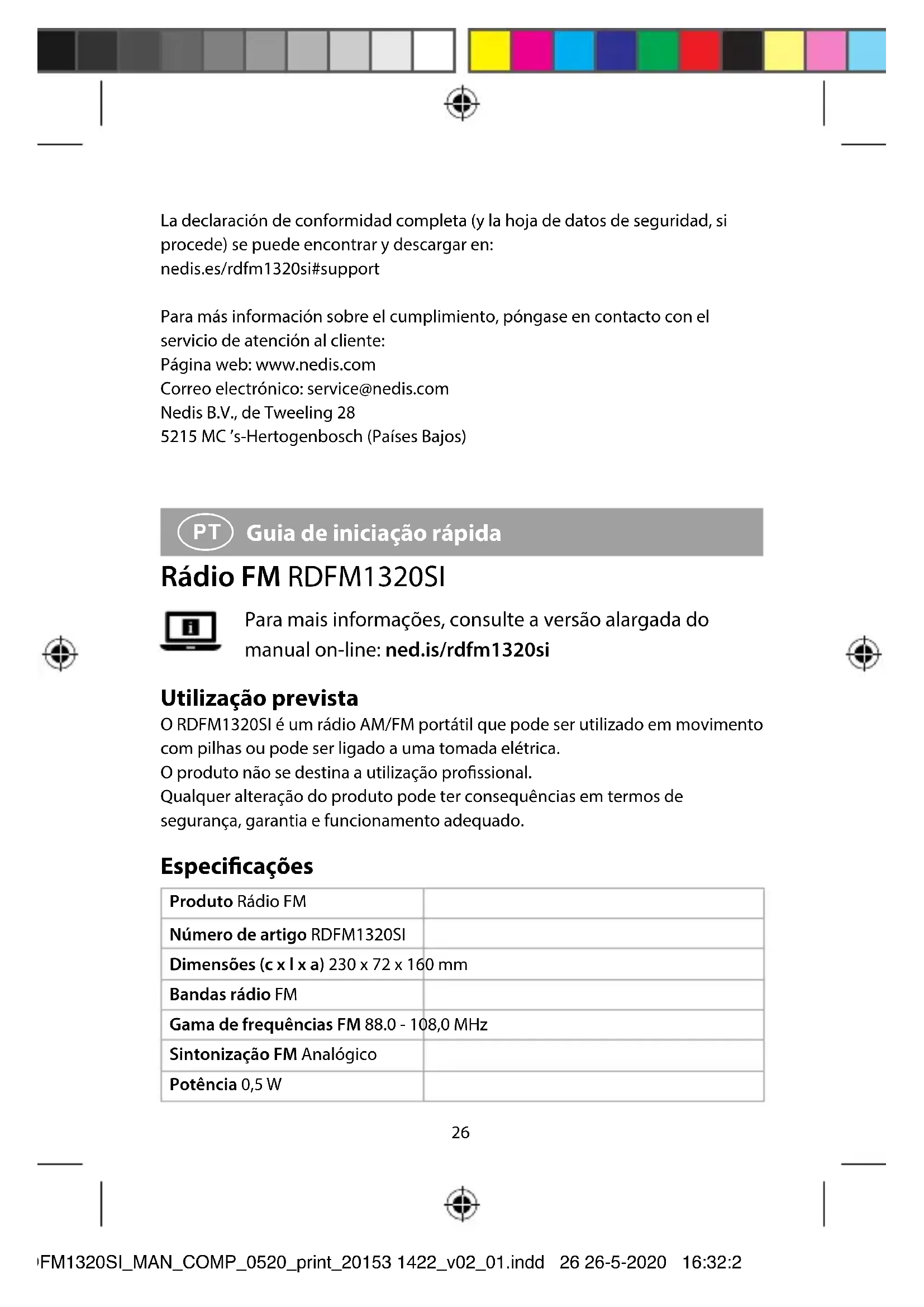 , produzido na China, foi testado em conformidade com todas as normas e regulamentos CE relevantes e que todos os testes foram concluídos com sucesso. Os mesmos incluem, entre outros, o regulamento RED 2014/53/UE. A Declaração de conformidade (e a cha de dados de segurança, se aplicável) pode ser consultada e descarregada em: nedis.pt/rdfm1320si#support Para informações adicionais relativas à conformidade, contacte a assistência ao cliente: Site: www.nedis.com RDFM1320SI_MAN_COMP_0520_print_20153 1422_v02_01.indd 29 26-5-2020 16:32:2230 E-mail: service@nedis.com Nedis B.V., de Tweeling 28 5215 MC ’s-Hertogenbosch, Países Baixos