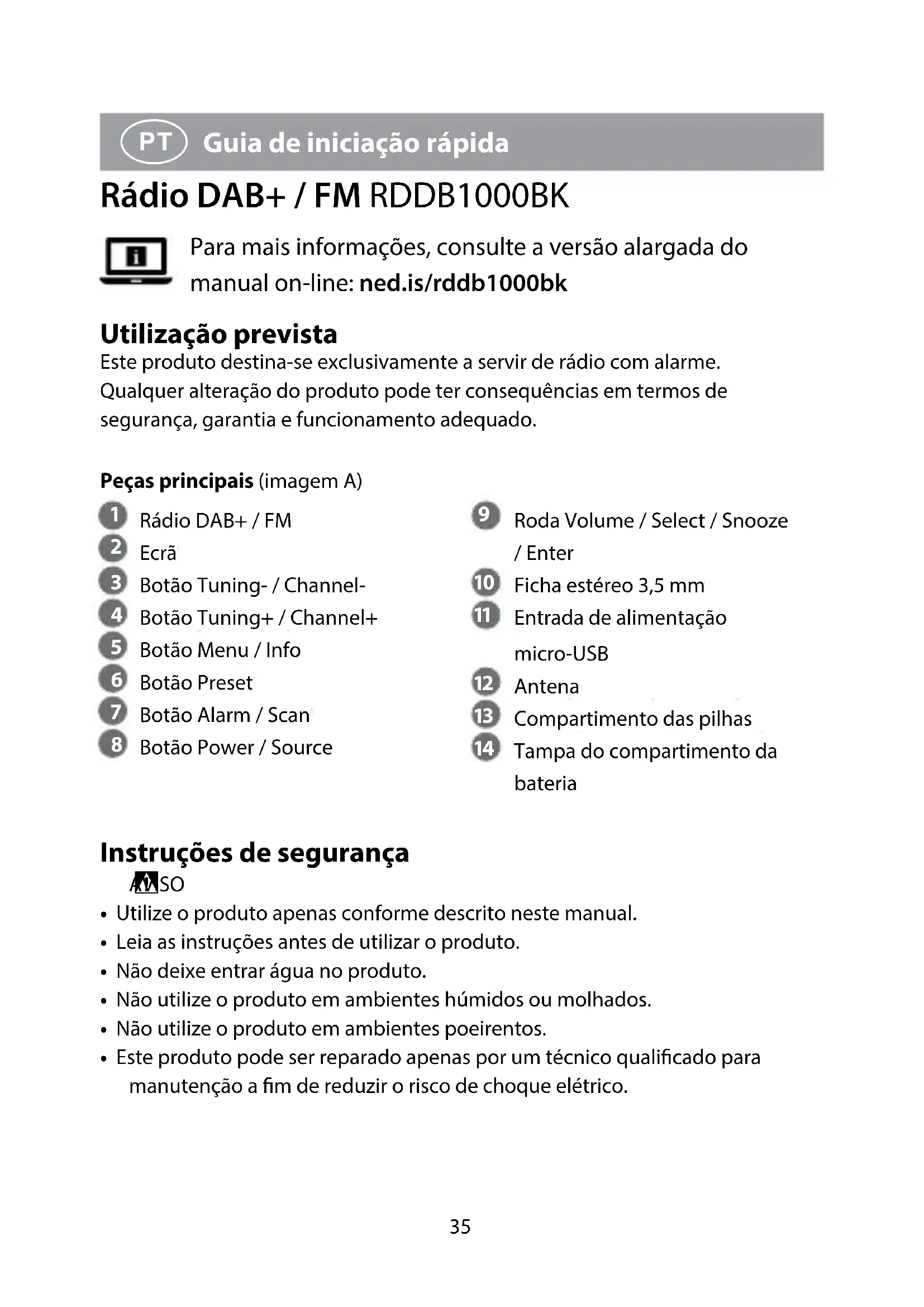 Guia de iniciação rápida Rádio DAB+ / FM RDDB1000BK Para mais informações, consulte a versão alargada do manual on-line: ned.is/rddb1000bk Utilização prevista Este produto destina-se exclusivamente a servir de rádio com alarme.Qualquer alteração do produto pode ter consequências em termos de segurança, garantia e funcionamento adequado.Peças principais (imagem A) Rádio DAB+ / FM