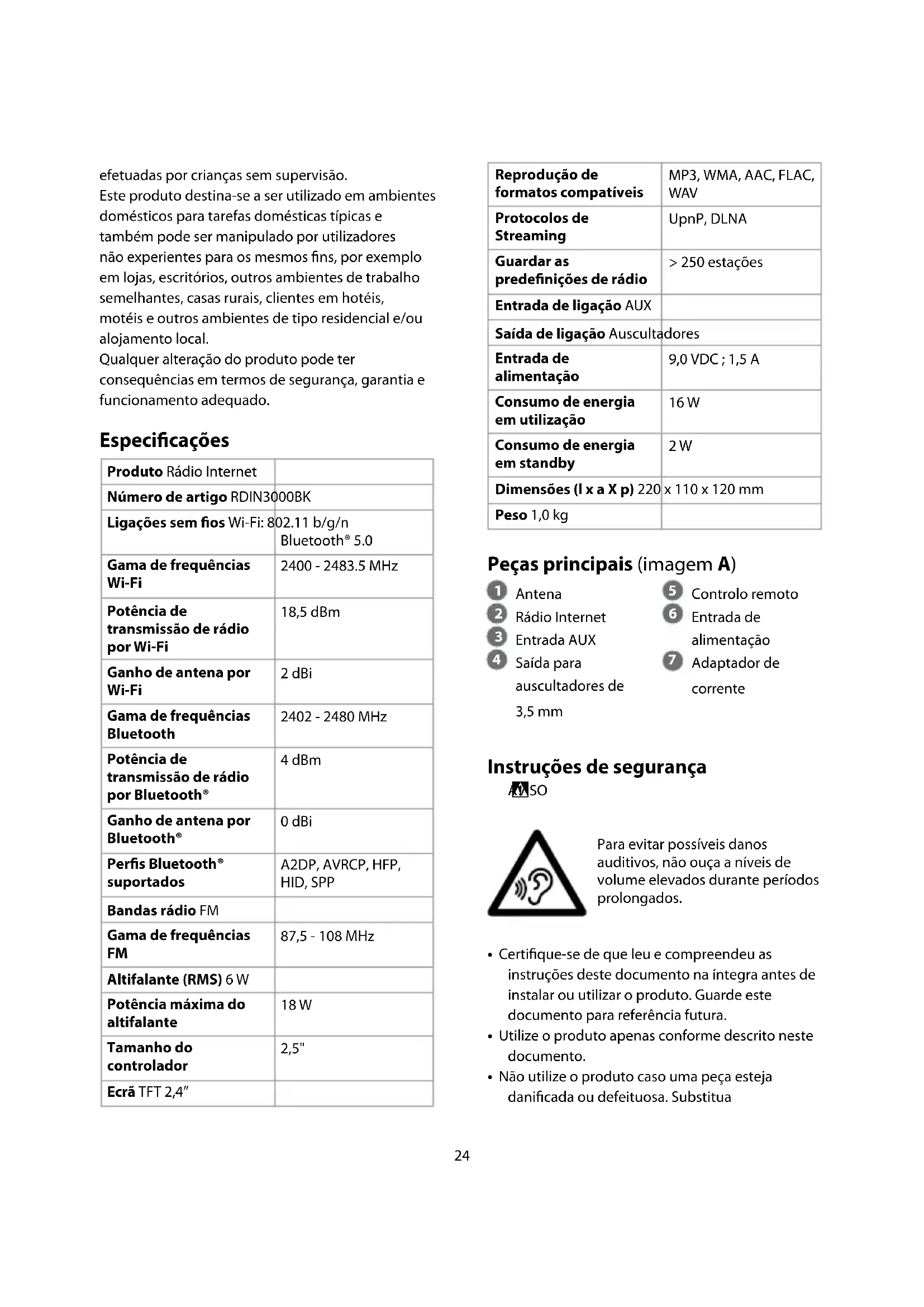 - Não utilize o produto caso uma peça esteja danificada ou defeituosa. Substitua efetuadas por crianças sem supervisão. Este produto destina-se a ser utilizado em ambientes domésticos para tarefas domésticas típicas e também pode ser manipulado por utilizadores não experientes para os mesmos fins, por exemplo em lojas, escritórios, outros ambientes de trabalho semelhantes, casas rurais, clientes em hotéis, motéis e outros ambientes de tipo residencial e/ou alojamento local. Qualquer alteração do produto pode ter consequências em termos de segurança, garantia e funcionamento adequado. Especicações Produto Rádio Internet Número de artigo RDIN3000BK Ligações sem os Wi-Fi: 802.11 b/g/n Bluetooth® 5.0 Gama de frequências Wi-Fi 2400 - 2483.5 MHz Potência de transmissão de rádio por Wi-Fi 18,5 dBm Ganho de antena por Wi-Fi 2 dBi Gama de frequências Bluetooth 2402 - 2480 MHz Potência de transmissão de rádio por Bluetooth® 4 dBm Ganho de antena por Bluetooth® 0 dBi Pers Bluetooth® suportados A2DP, AVRCP, HFP, HID, SPP Bandas rádio FM Gama de frequências