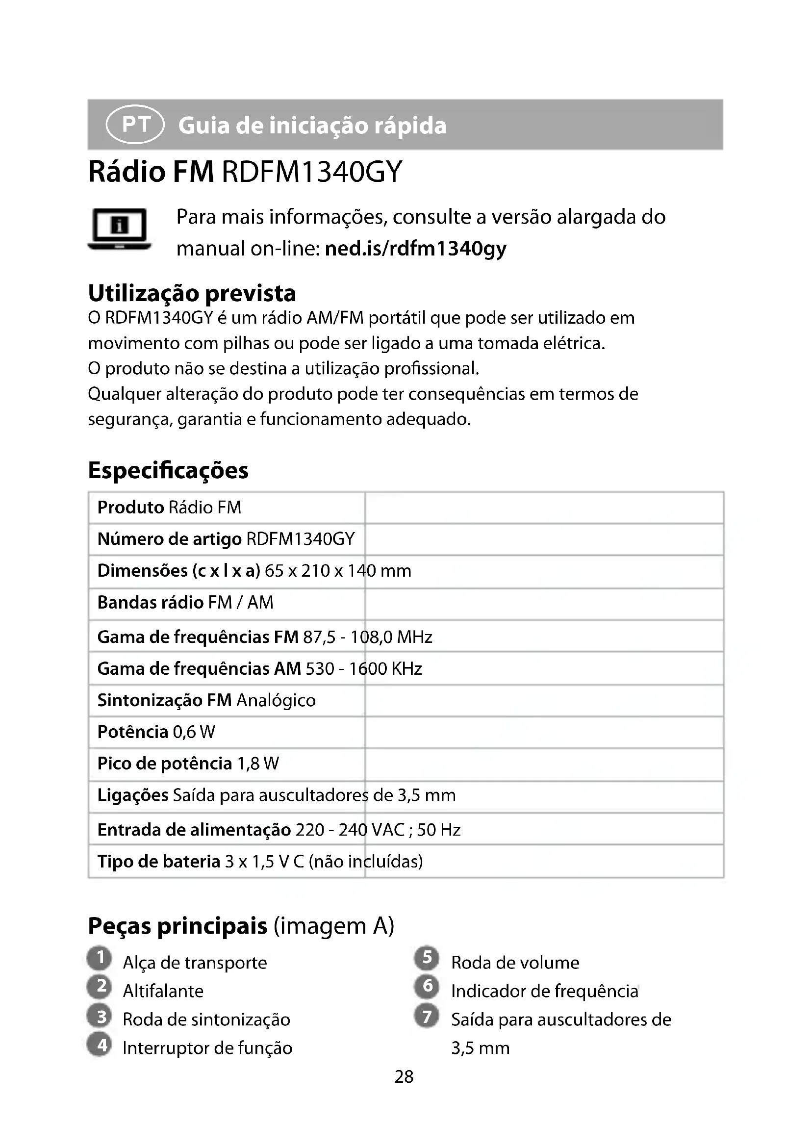 Guia de iniciação rápida Rádio FM RDFM1340GY Para mais informações, consulte a versão alargada do manual on-line: ned.is/rdfm1340gy Utilização prevista O RDFM1340GY é um rádio AM/FM portátil que pode ser utilizado em movimento com pilhas ou pode ser ligado a uma tomada elétrica. O produto não se destina a utilização prossional. Qualquer alteração do produto pode ter consequências em termos de segurança, garantia e funcionamento adequado. Especicações Produto Rádio FM Número de artigo RDFM1340GY Dimensões (c x l x a) 65 x 210 x 140 mm Bandas rádio FM / AM Gama de frequências FM 87,5 - 108,0 MHz Gama de frequências AM 530 - 1600 KHz Sintonização FM Analógico Potência 0,6 W Pico de potência 1,8 W Ligações Saída para auscultadores de 3,5 mm Entrada de alimentação 220 - 240 VAC ; 50 Hz Tipo de bateria 3 x 1,5 V C (não incluídas) Peças principais (imagem A)