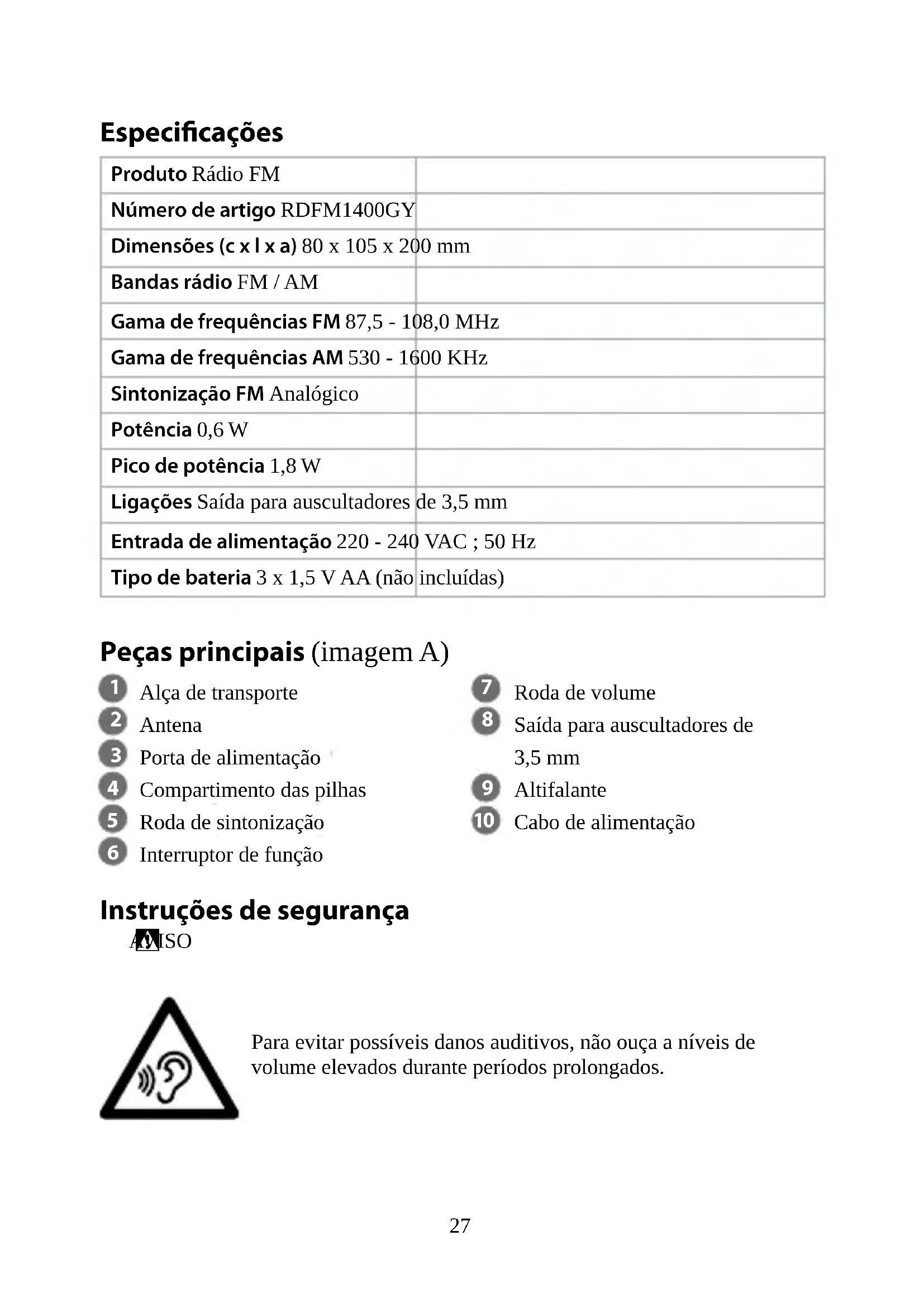 Guia de iniciação rápida Rádio FM RDFM1400GY Para mais informações, consulte a versão alargada do manual on-line: ned.is/rdfm1400gy Utilização prevista O RDFM1400GY é um rádio AM/FM portátil que pode ser utilizado em movimento com pilhas ou pode ser ligado a uma tomada elétrica.O produto não se destina a utilização prossional.Qualquer alteração do produto pode ter consequências em termos de segurança, garantia e funcionamento adequado.27 Especicações Produto Rádio FM Número de artigo RDFM1400GY Dimensões (c x l x a) 80 x 105 x 200 mm Bandas rádio FM / AM Gama de frequências FM 87,5 - 108,0 MHz Gama de frequências AM 530 - 1600 KHz Sintonização FM Analógico Potência 0,6 W Pico de potência 1,8 W Ligações Saída para auscultadores de 3,5 mm Entrada de alimentação 220 - 240 VAC ; 50 Hz Tipo de bateria 3 x 1,5 V AA (não incluídas) Peças principais (imagem A)