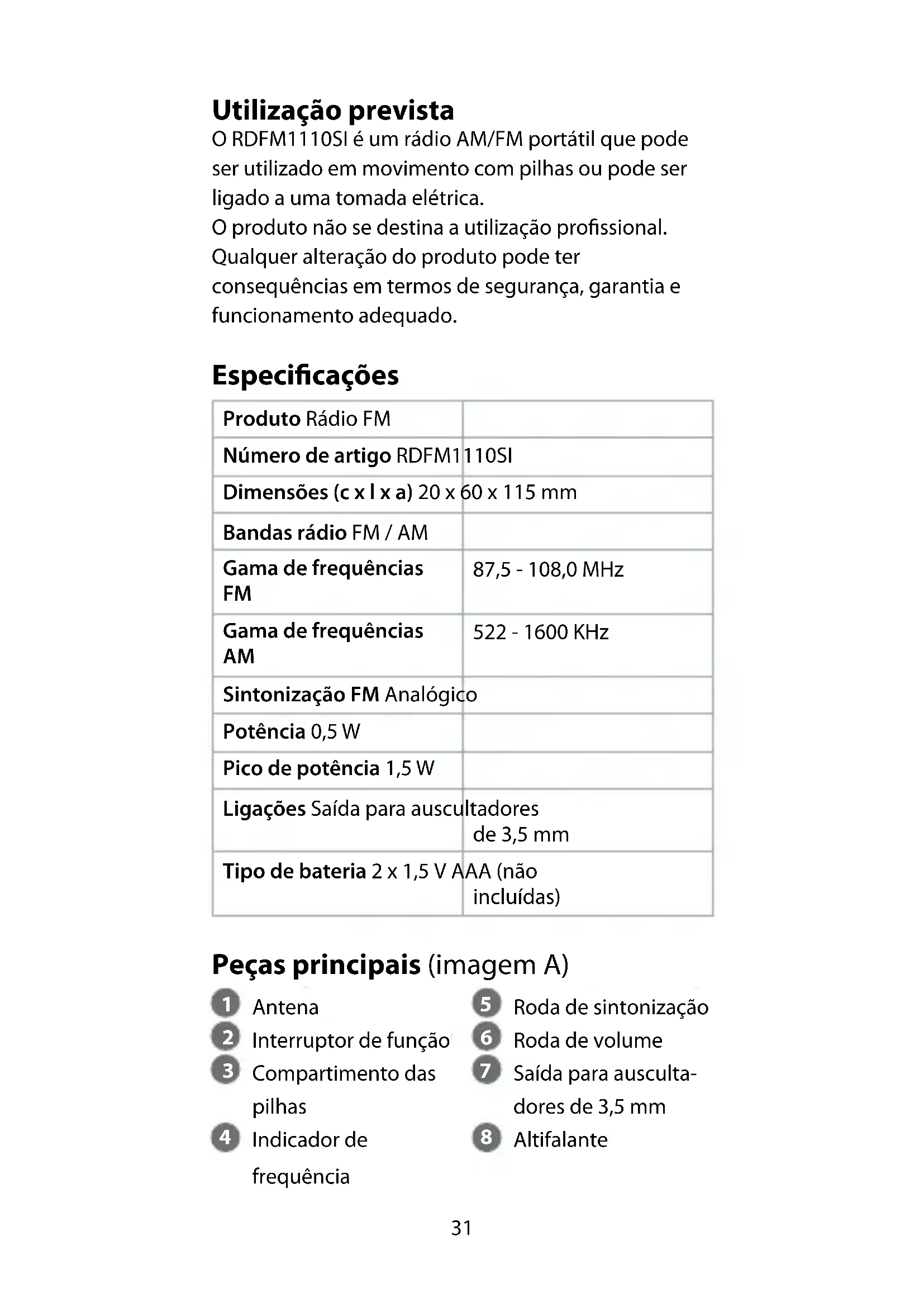 Sintonização FM Analógico Potência 0,5 W Pico de potência 1,5 W Ligações Saída para auscultadores de 3,5 mm Tipo de bateria 2 x 1,5 V AAA (não incluídas) Peças principais (imagem A)