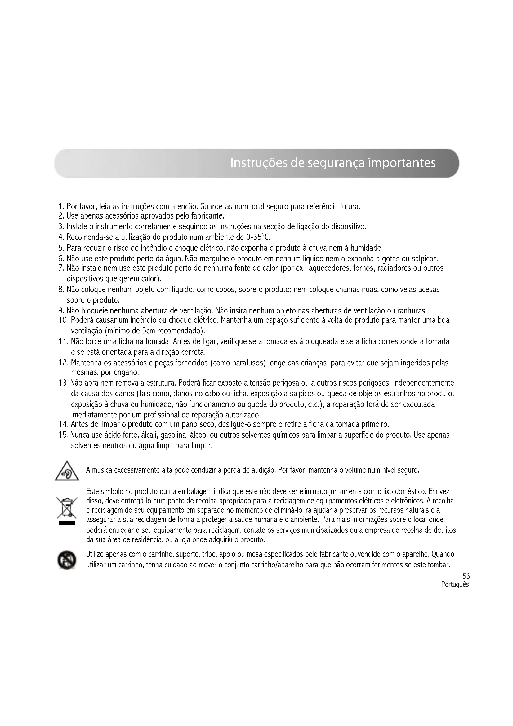 Nunca use ácido forte, álcali, gasolina, álcool ou outros solventes químicos para limpar a superfície do produto. Use apenas solventes neutros ou água limpa para limpar.57 Português Instruções de segurança importantes Este símbolo serve para alertar o utilizador para a presença de tensão perigosa não isolada dentro do compartimento do produto, a qual pode ter magnitude suficiente para constituir um risco de choque elétrico para as pessoas. Este símbolo serve para avisar o utilizador para não desmontar o compartimento do produto e que não existem peças passíveis de substituição pelo utilizador. Leve o produto a um centro de reparação autorizado para reparação. Este símbolo indica que o produto destina-se apenas ao uso no interior. Este símbolo indica que o produto é CLASSE II ou um dispositivo elétrico com duplo isolamento sem ligação à terra necessária. Aviso de potência: