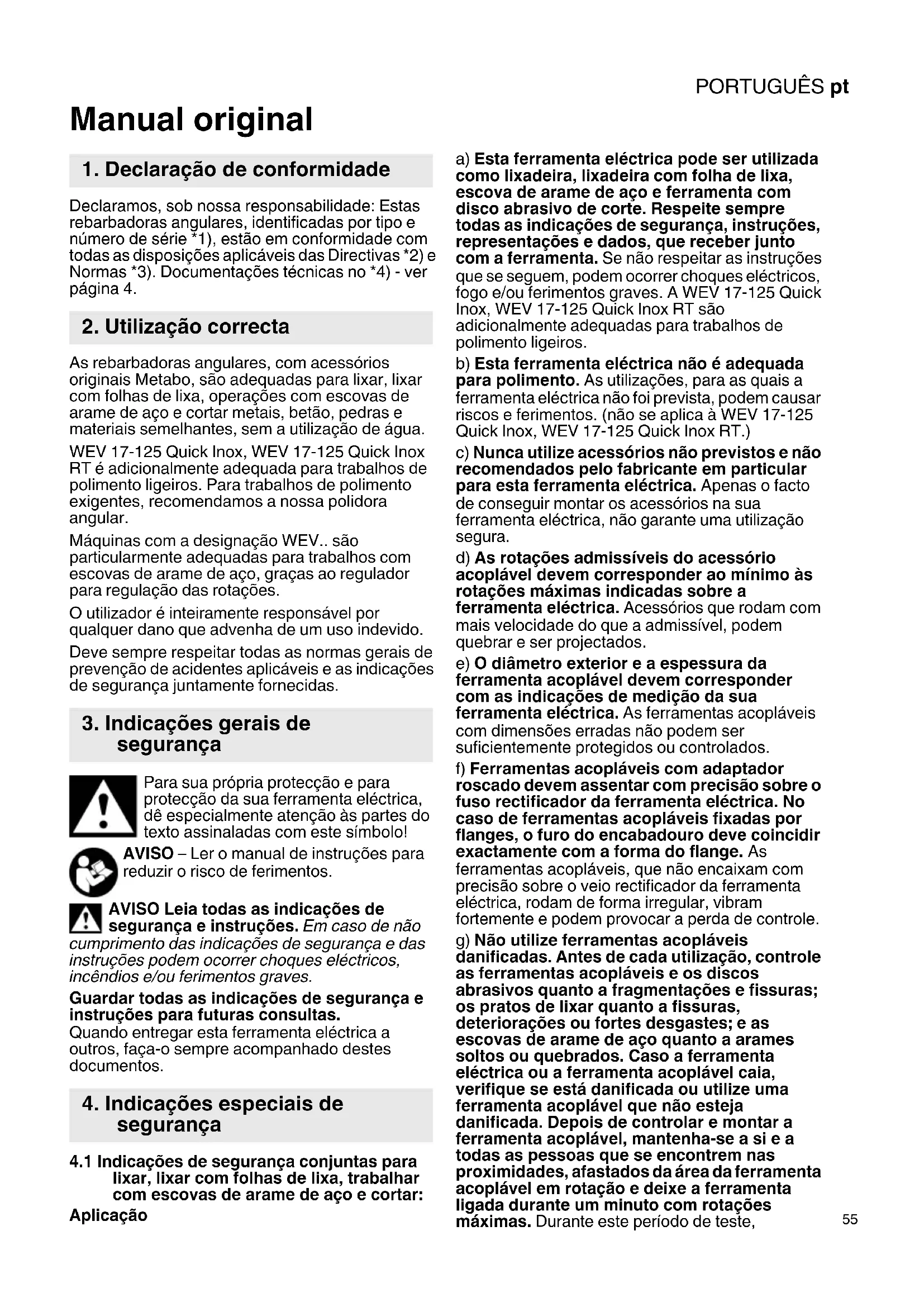 Manual original Declaramos, sob nossa responsabilidade: Estas rebarbadoras angulares, identificadas por tipo e número de série *1), estão em conformidade com todas as disposições aplicáveis das Directivas *2) e Normas *3). Documentações técnicas no *4) - ver página 4. As rebarbadoras angulares, com acessórios originais Metabo, são adequadas para lixar, lixar com folhas de lixa, operações com escovas de arame de aço e cortar metais, betão, pedras e materiais semelhantes, sem a utilização de água. WEV 17-125 Quick Inox, WEV 17-125 Quick Inox RT é adicionalmente adequada para trabalhos de polimento ligeiros. Para trabalhos de polimento exigentes, recomendamos a nossa polidora angular. Máquinas com a designação WEV.. são particularmente adequadas para trabalhos com escovas de arame de aço, graças ao regulador para regulação das rotações. O utilizador é inteiramente responsável por qualquer dano que advenha de um uso indevido. Deve sempre respeitar todas as normas gerais de prevenção de acidentes aplicáveis e as indicações de segurança juntamente fornecidas. Para sua própria protecção e para protecção da sua ferramenta eléctrica, dê especialmente atenção às partes do texto assinaladas com este símbolo! AVISO – Ler o manual de instruções para reduzir o risco de ferimentos. AVISO Leia todas as indicações de segurança e instruções. Em caso de não cumprimento das indicações de segurança e das instruções podem ocorrer choques eléctricos, incêndios e/ou ferimentos graves. Guardar todas as indicações de segurança e instruções para futuras consultas. Quando entregar esta ferramenta eléctrica a outros, faça-o sempre acompanhado destes documentos.