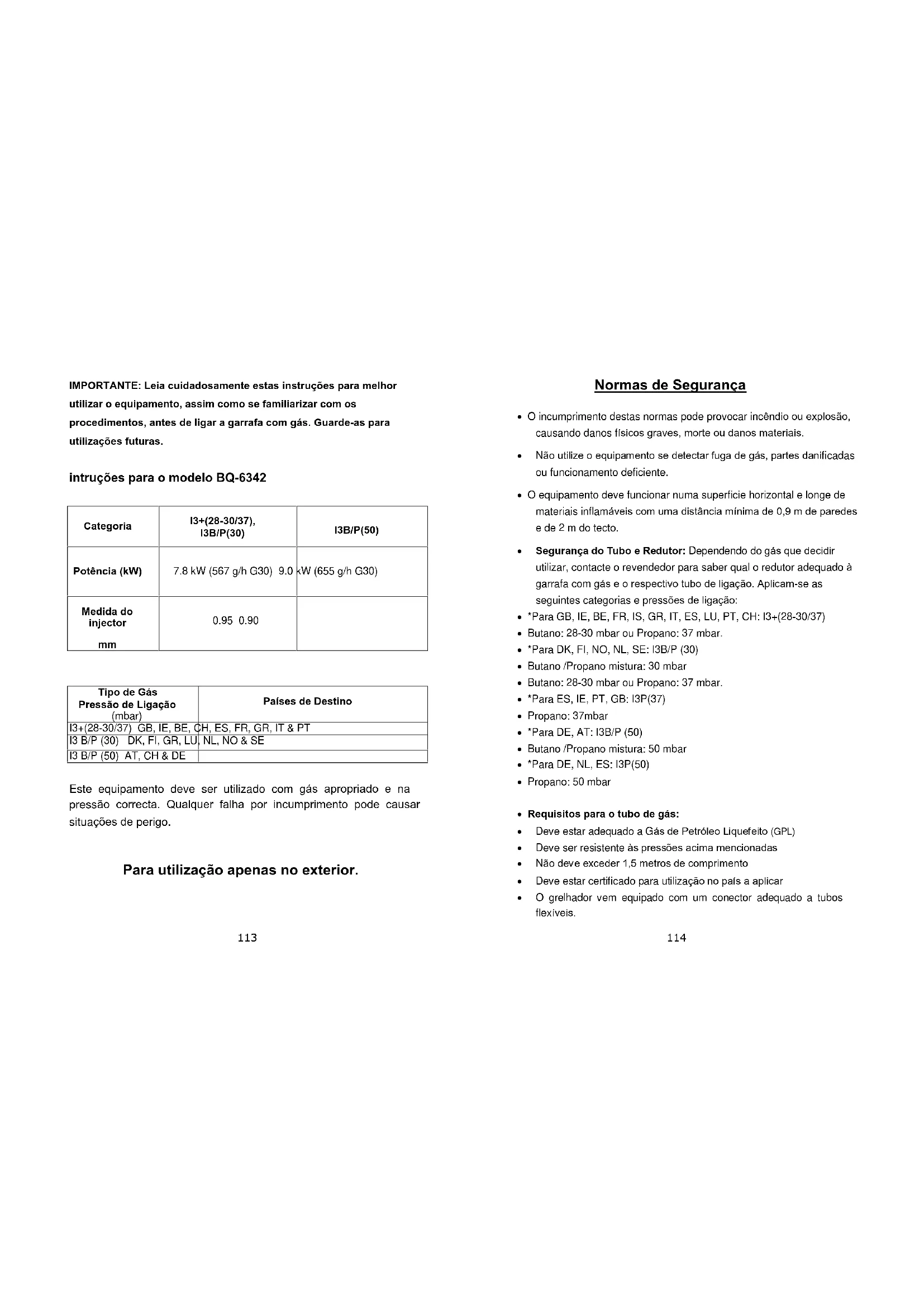 Normas de Segurança O incumprimento destas normas pode provocar incêndio ou explosão, causando danos físicos graves, morte ou danos materiais. Não utilize o equipamento se detectar fuga de gás, partes danificadas ou funcionamento deficiente. O equipamento deve funcionar numa superficie horizontal e longe de materiais inflamáveis com uma distância mínima de 0,9 m de paredes e de 2 m do tecto. Segurança do Tubo e Redutor: Dependendo do gás que decidir utilizar, contacte o revendedor para saber qual o redutor adequado à garrafa com gás e o respectivo tubo de ligação. Aplicam-se as seguintes categorias e pressões de ligação: *Para GB, IE, BE, FR, IS, GR, IT, ES, LU, PT, CH: I3+(28-30/37) Butano: 28-30 mbar ou Propano: 37 mbar. *Para DK, FI, NO, NL, SE: I3B/P (30) Butano /Propano mistura: 30 mbar Butano: 28-30 mbar ou Propano: 37 mbar. *Para ES, IE, PT, GB: I3P(37) Propano: 37mbar *Para DE, AT: I3B/P (50) Butano /Propano mistura: 50 mbar *Para DE, NL, ES: I3P(50) Propano: 50 mbar Requisitos para o tubo de gás: Deve estar adequado a Gás de Petróleo Liquefeito (GPL) Deve ser resistente às pressões acima mencionadas Não deve exceder 1,5 metros de comprimento Deve estar certificado para utilização no país a aplicar O grelhador vem equipado com um conector adequado a tubos flexíveis.115 Após a montagem ser averiguada, ligue o gás e verifique se existem fugas através do cheiro ou passando espuma de sabão nas ligações suspeitas. AVISO: Nunca ponha o grelhador a funcionar sem o redutor de gás em garrafa. Este é um grelhador de baixa pressão e deve ser usado apenas com redutores e tubo específicos. Quando ligar o tubo e o redutor à garrafa com gás tenha cuidado para não torcer o tubo. Mantenha o tubo de gás afastado de superfícies quentes. Proteja o tubo de gordura a pingar. Evite torcer o tubo desnessesariamente. Verifique visualmente, antes de cada utilização, se o tubo apresenta fendas, gasto por utilização excessiva ou outro tipo de dano. Substitua o tubo, caso seja necessário. Nunca inspeccione fugas de gás com fósforos ou outro tipo de chama, utilize espuma de sabão. Nunca altere o redutor ou a montagem da entrada de gás. Este grelhador não pode ser usado no interior das habitações. AVISO: as peças que estão ao alcance das pessoas podem estar extremamente quentes. Mantenha as crianças afastadas. Mantenha as crianças afastadas durante a utilização do grelhador e até que este tenha arrefecido após a utilização. Não permita que as crianças utilizem o grelhador. Qualquer modificação realizada neste equipamento poder ser perigosa. Não movimente o equipamento durante a sua utilização. NÃO utilize o grelhador em garagens, varandas, alpendres, telheiros ou outras áreas fechadas. O seu grellhador é para ser usado apenas ao AR LIVRE. O grelhador não foi concebido para ser instalado em veículos de recreio e /ou em barcos e não pode ser colocado por baixo de qualquer superfície inflamável. Não obstrua o fluxo da combustão e a ventilação de ar à volta do grelhador.
