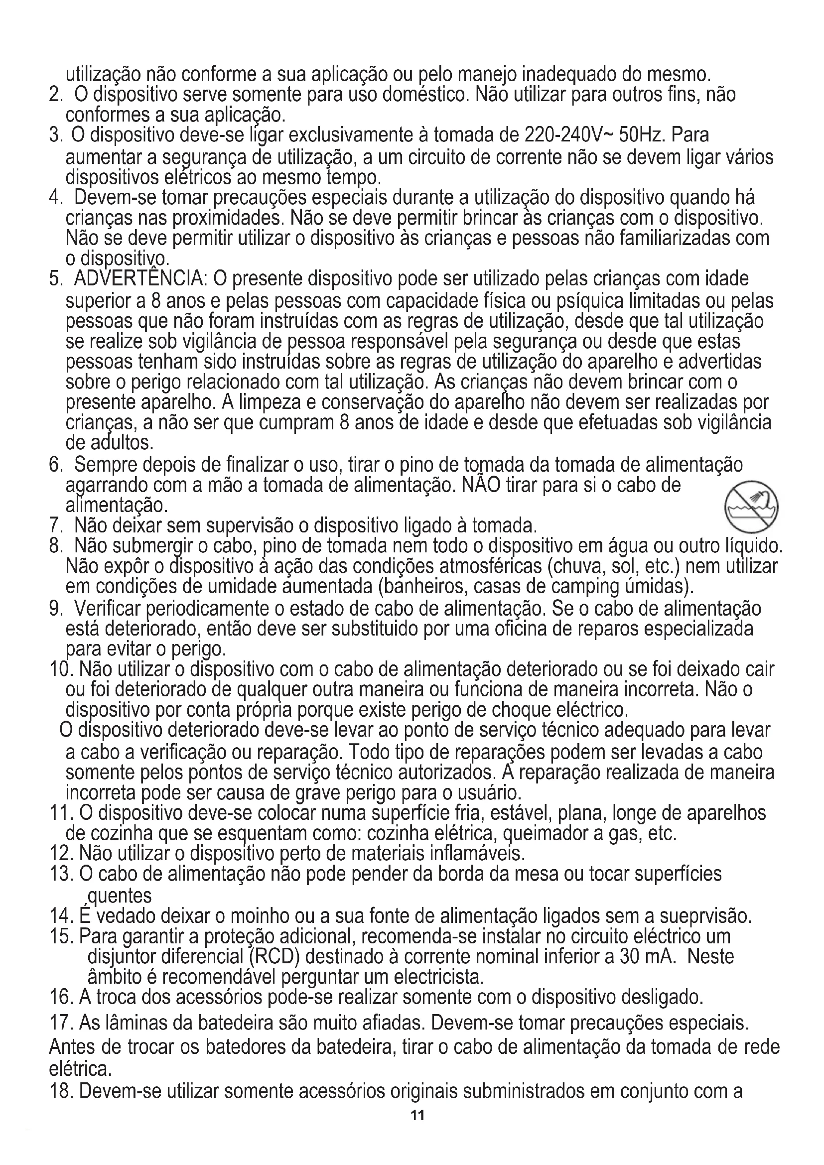 10. Não utilizar o dispositivo com o cabo de alimentação deteriorado ou se foi deixado cair