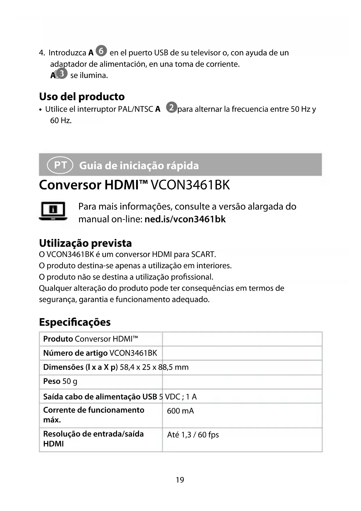 Guia de iniciação rápida Conversor HDMI™ VCON3461BK Para mais informações, consulte a versão alargada do manual on-line: ned.is/vcon3461bk Utilização prevista O VCON3461BK é um conversor HDMI para SCART.O produto destina-se apenas a utilização em interiores.O produto não se destina a utilização prossional.Qualquer alteração do produto pode ter consequências em termos de segurança, garantia e funcionamento adequado. Especicações Produto Conversor HDMI™Número de artigo VCON3461BKDimensões (l x a X p) 58,4 x 25 x 88,5 mmPeso 50 gSaída cabo de alimentação USB 5 VDC ; 1 ACorrente de funcionamento máx. 600 mAResolução de entrada/saída HDMI Até 1,3 / 60 fps20 Compatível com formato de vídeo HDMI a cores 24 bit / cor profunda 30 bit / 36 bit Largura de banda HDMI máxima 300 MHz Taxa de transmissão HDMI máxima 10,2 Gbps Sinal TMDS entrada / saída 0,5 ~ 1,5 V p-p (TTL) Sinal DDC entrada / saída 5 V p-p (TTL) Saída analógica RCA (1 KHZ a 0 dB ) 1 V RMS Relação sinal-ruído a dB (CC1R / ARM) ≥ 90 dB Distorção ≤ 0,1 % Resposta de frequência 20 Hz ~ 20000 Hz Comprimento máximo do cabo de entrada HDMI Cabo HDMI standard ≤ 7 m AWG26 Comprimento máximo do cabo de saída SCART Cabo SCART standard ≤ 8 m AWG26 Temperatura de funcionamento -10 °C – 55 °C Temperatura de armazenamento -20 °C – 60 °C Humidade de funcionamento 10 - 90% HR (sem condensação) Humidade de armazenamento 5 - 95% HR (sem condensação) Peças principais (imagem A)