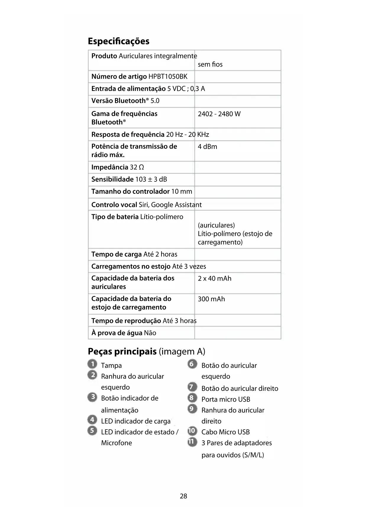 Guia de iniciação rápida Auriculares integralmente sem os HPBT1050BK Para mais informações, consulte a versão alargada do manual on-line: ned.is/hpbt1050bk Utilização prevista O HPBT1050BK da Nedis é um par de auriculares integralmente sem os. Este produto pode ser emparelhado com qualquer dispositivo de áudio/vídeo com Bluetooth. Os auriculares podem ser carregados até 3 vezes no estojo de carregamento. Qualquer alteração do produto pode ter consequências em termos de segurança, garantia e funcionamento adequado.28 Especicações Produto Auriculares integralmente sem os Número de artigo HPBT1050BK Entrada de alimentação 5 VDC ; 0,3 A Versão Bluetooth® 5.0 Gama de frequências Bluetooth® 2402 - 2480 W Resposta de frequência 20 Hz - 20 KHz Potência de transmissão de rádio máx. 4 dBm Impedância 32 Ω Sensibilidade 103 ± 3 dB Tamanho do controlador 10 mm Controlo vocal Siri, Google Assistant Tipo de bateria Lítio-polímero (auriculares) Lítio-polímero (estojo de carregamento) Tempo de carga Até 2 horas Carregamentos no estojo Até 3 vezes Capacidade da bateria dos auriculares 2 x 40 mAh Capacidade da bateria do estojo de carregamento 300 mAh Tempo de reprodução Até 3 horas À prova de água Não Peças principais (imagem A)