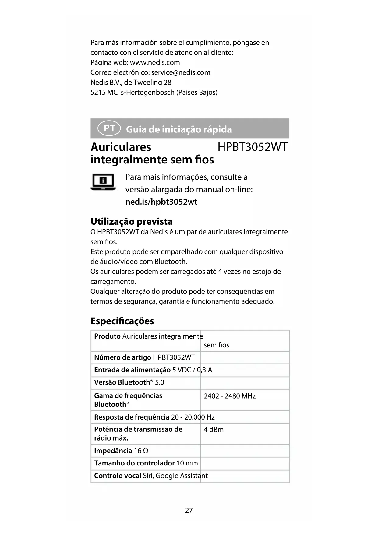 , produzido na China, foi testado em conformidade com todas as normas e regulamentos CE relevantes e que todos os testes foram concluídos com sucesso. Os mesmos incluem, entre outros, o regulamento RED 2014/53/UE. A Declaração de conformidade (e a cha de dados de segurança, se aplicável) pode ser consultada e descarregada em: nedis.pt/hpbt3052wt#support Para informações adicionais relativas à conformidade, contacte a assistência ao cliente: Site: www.nedis.com E-mail: service@nedis.com31 Nedis B.V., de Tweeling 28 5215 MC ’s-Hertogenbosch, Países Baixos