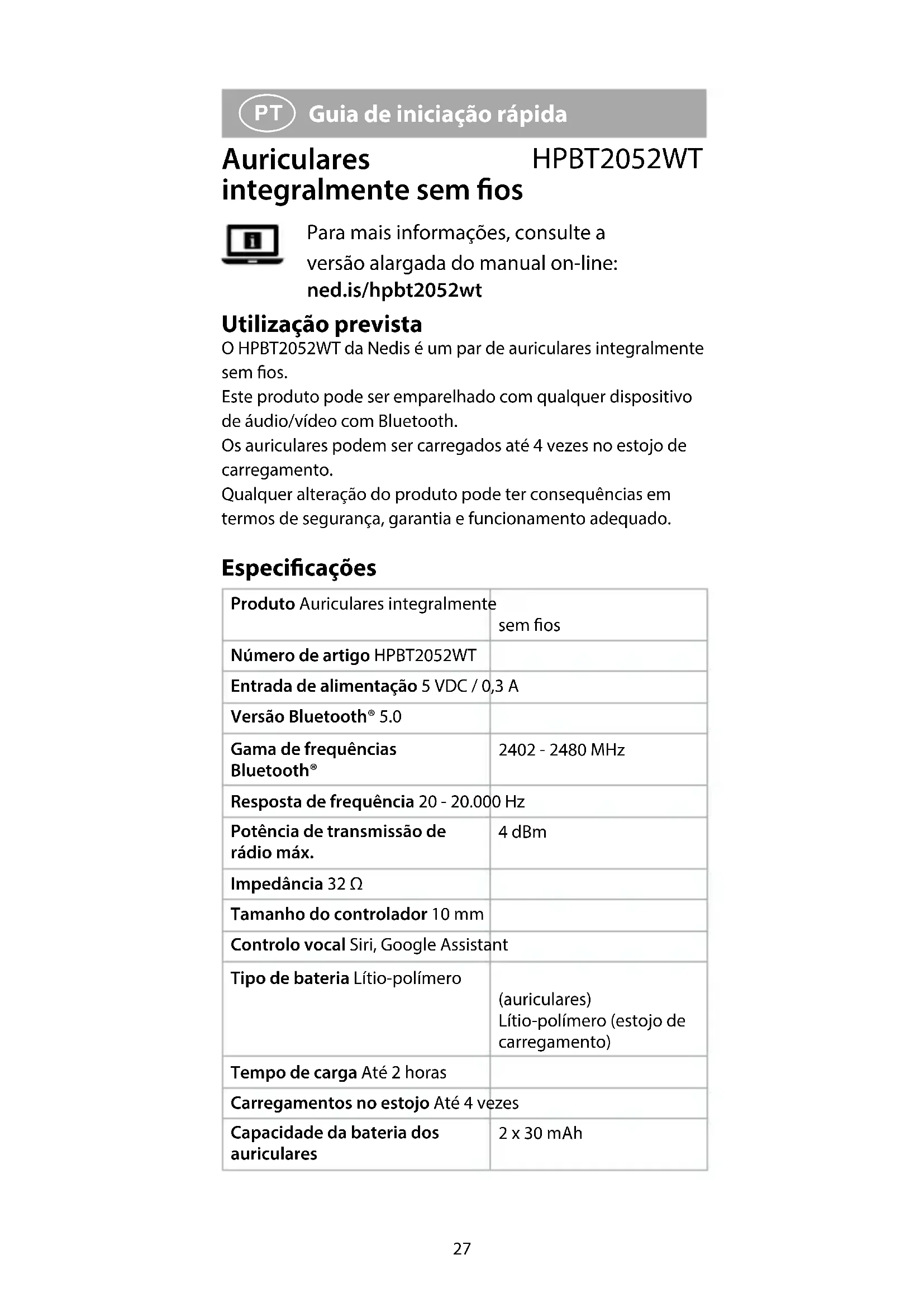 Guia de iniciação rápida Auriculares integralmente sem os HPBT2052WT Para mais informações, consulte a versão alargada do manual on-line: ned.is/hpbt2052wt Utilização prevista O HPBT2052WT da Nedis é um par de auriculares integralmente sem os. Este produto pode ser emparelhado com qualquer dispositivo de áudio/vídeo com Bluetooth. Os auriculares podem ser carregados até 4 vezes no estojo de carregamento. Qualquer alteração do produto pode ter consequências em termos de segurança, garantia e funcionamento adequado. Especicações Produto Auriculares integralmente sem os Número de artigo HPBT2052WT Entrada de alimentação 5 VDC / 0,3 A Versão Bluetooth® 5.0 Gama de frequências Bluetooth® 2402 - 2480 MHz Resposta de frequência 20 - 20.000 Hz Potência de transmissão de rádio máx. 4 dBm Impedância 32 Ω Tamanho do controlador 10 mm Controlo vocal Siri, Google Assistant Tipo de bateria Lítio-polímero (auriculares) Lítio-polímero (estojo de carregamento) Tempo de carga Até 2 horas Carregamentos no estojo Até 4 vezes Capacidade da bateria dos auriculares 2 x 30 mAh28 Capacidade da bateria do estojo de carregamento 300 mAh Tempo de reprodução Até 2,5 horas À prova de água Não Controlo por toque Sim Peças principais (imagem A)
