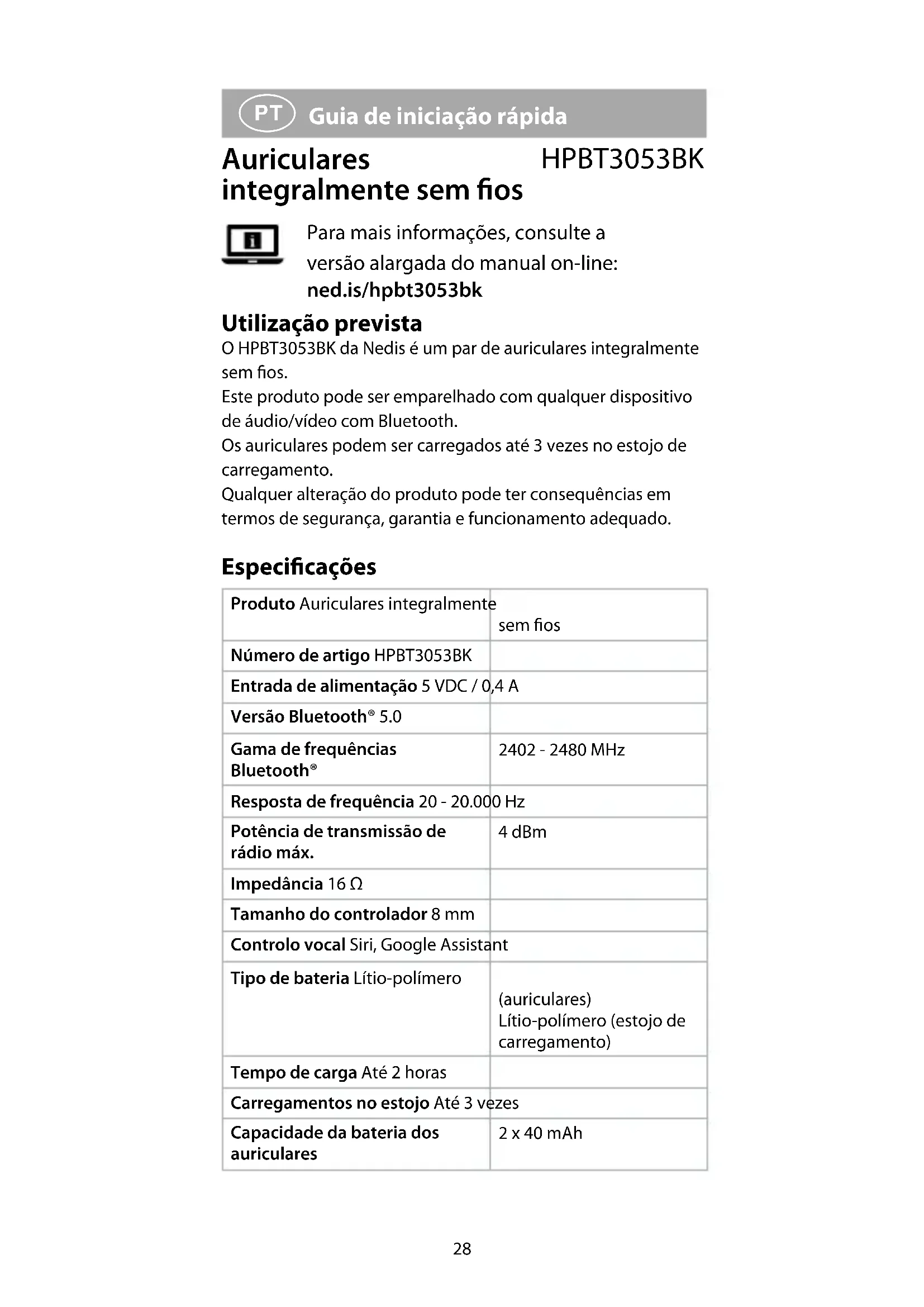 Guia de iniciação rápida Auriculares integralmente sem os HPBT3053BK Para mais informações, consulte a versão alargada do manual on-line: ned.is/hpbt3053bk Utilização prevista O HPBT3053BK da Nedis é um par de auriculares integralmente sem os. Este produto pode ser emparelhado com qualquer dispositivo de áudio/vídeo com Bluetooth. Os auriculares podem ser carregados até 3 vezes no estojo de carregamento. Qualquer alteração do produto pode ter consequências em termos de segurança, garantia e funcionamento adequado. Especicações Produto Auriculares integralmente sem os Número de artigo HPBT3053BK Entrada de alimentação 5 VDC / 0,4 A Versão Bluetooth® 5.0 Gama de frequências Bluetooth® 2402 - 2480 MHz Resposta de frequência 20 - 20.000 Hz Potência de transmissão de rádio máx. 4 dBm Impedância 16 Ω Tamanho do controlador 8 mm Controlo vocal Siri, Google Assistant Tipo de bateria Lítio-polímero (auriculares) Lítio-polímero (estojo de carregamento) Tempo de carga Até 2 horas Carregamentos no estojo Até 3 vezes Capacidade da bateria dos auriculares 2 x 40 mAh29 Capacidade da bateria do estojo de carregamento 300 mAh Tempo de reprodução Até 3 horas À prova de água Não Controlo por toque Sim Peças principais (imagem A)