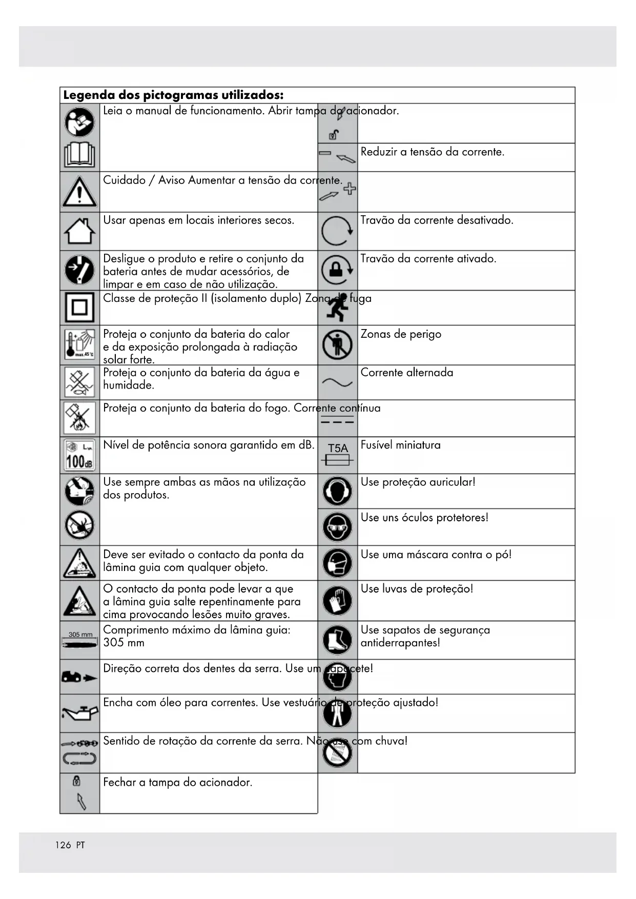 Proteja o conjunto da bateria da água e humidade. Corrente alternada Proteja o conjunto da bateria do fogo. Corrente contínua Nível de potência sonora garantido em dB. T5A Fusível miniatura Use sempre ambas as mãos na utilização dos produtos. Use proteção auricular! Use uns óculos protetores! Deve ser evitado o contacto da ponta da lâmina guia com qualquer objeto. Use uma máscara contra o pó! O contacto da ponta pode levar a que a lâmina guia salte repentinamente para cima provocando lesões muito graves. Use luvas de proteção! 305 mm Comprimento máximo da lâmina guia: 305 mm Use sapatos de segurança antiderrapantes! Direção correta dos dentes da serra. Use um capacete! Encha com óleo para correntes. Use vestuário de proteção ajustado! Sentido de rotação da corrente da serra. Não use com chuva! Fechar a tampa do acionador.